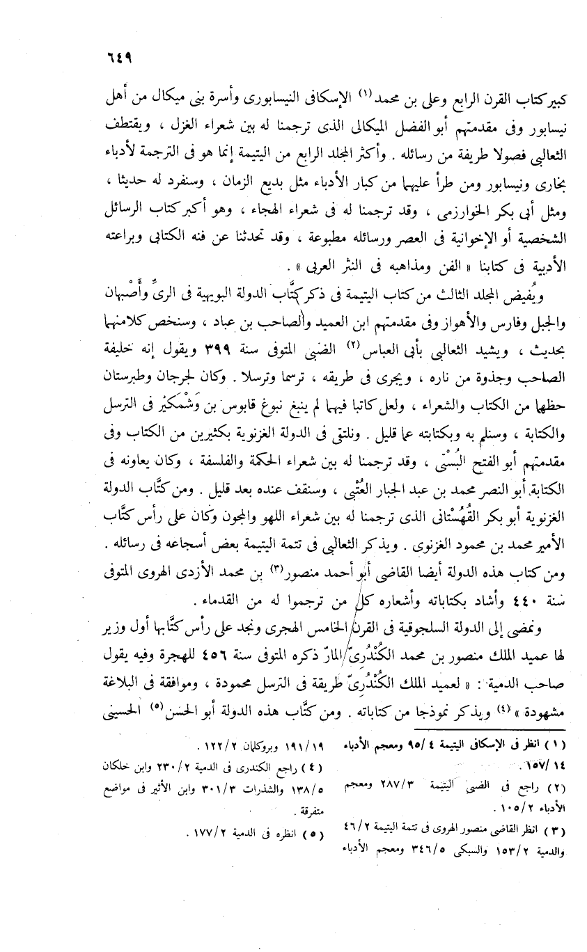 كبير كتاب القرن الرابع وعلى بن محمد (¬1) الإسكافى النيسابورى وأسرة بنى ميكال من أهل نيسابور وفى مقدمتهم أبو الفضل الميكالى الذى ترجمنا له بين شعراء الغزل، ويقتطف الثعالبى فصولا طريفة من رسائله. وأكثر المجلد الرابع من اليتيمة إنما هو فى الترجمة لأدباء بخارى ونيسابور ومن طرأ عليهما من كبار الأدباء مثل بديع الزمان، وسنفرد له حديثا، ومثل أبى بكر الخوارزمى، وقد ترجمنا له فى شعراء الهجاء، وهو أكبر كتاب الرسائل الشخصية أو الإخوانية فى العصر ورسائله مطبوعة، وقد تحدثنا عن فنه الكتابى وبراعته الأدبية فى كتابنا «الفن ومذاهبه فى النثر العربى».