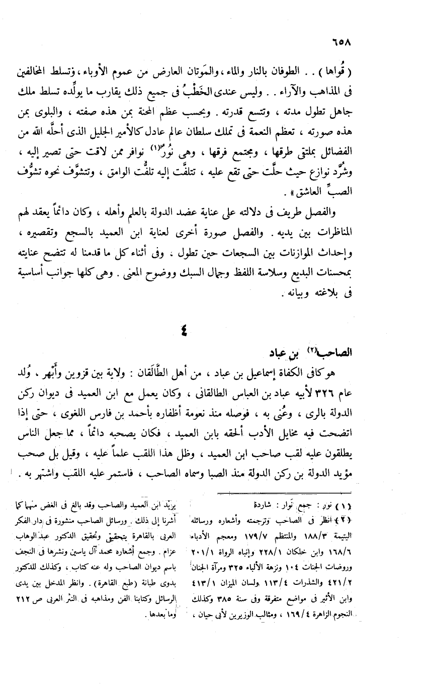 (¬2) انظر فى الصاحب وترجمته وأشعاره ورسائله اليتيمة 3/ 188 والمنتظم 7/ 179 ومعجم الأدباء 6/ 168 وابن خلكان 1/ 228 وإنباه الرواة 1/ 201 وروضات الجنات 104 ونزهة الألباء 325 ومرآة الجنان 2/ 421 والشذرات 4/ 113 ولسان الميزان 1/ 413 وابن الأثير فى مواضع متفرقة وفى سنة 385 وكذلك النجوم الزاهرة 4/ 169، ومثالب الوزيرين لأبى حيان، يريد ابن العميد والصاحب وقد بالغ فى الغض منهما كما أشرنا إلى ذلك. ورسائل الصاحب منشورة فى دار الفكر العربى بالقاهرة بتحقيقى وتحقيق الدكتور عبد الوهاب عزام. وجمع أشعاره محمد آل ياسين ونشرها فى النجف باسم ديوان الصاحب وله عنه كتاب، وكذلك للدكتور بدوى طبانة (طبع القاهرة). وانظر المدخل بين يدى الرسائل وكتابنا الفن ومذاهبه فى النثر العربى ص 212 وما بعدها.