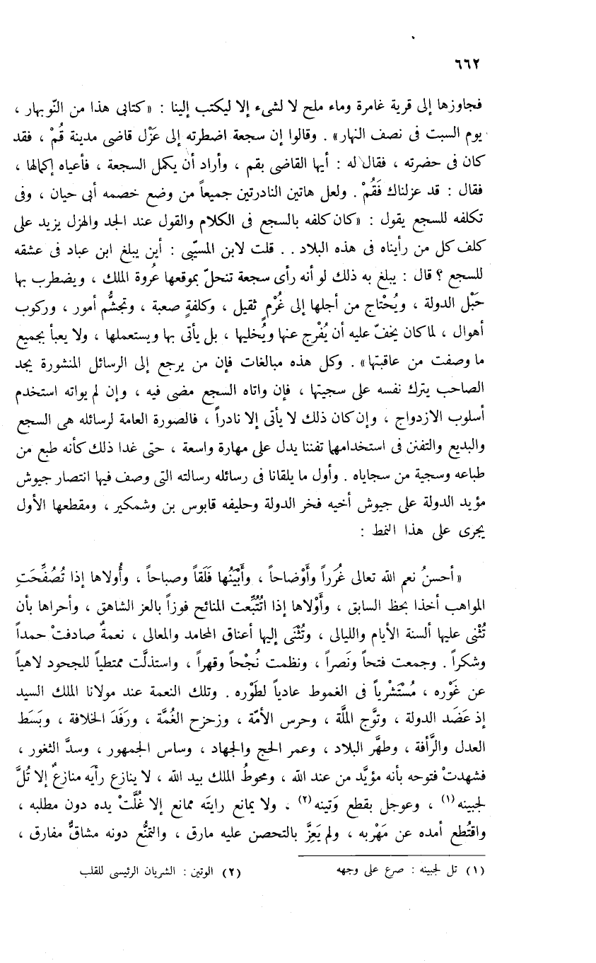 فجاوزها إلى قرية غامرة وماء ملح لا لشئ إلا ليكتب إلينا: «كتابى هذا من النّوبهار، يوم السبت فى نصف النهار». وقالوا إن سجعة اضطرته إلى عزل قاضى مدينة قم، فقد كان فى حضرته، فقال له: أيها القاضى بقم، وأراد أن يكمل السجعة، فأعياه إكمالها، فقال: قد عزلناك فقم. ولعل هاتين النادرتين جميعا من وضع خصمه أبى حيان، وفى تكلفه للسجع يقول: «كان كلفه بالسجع فى الكلام والقول عند الجد والهزل يزيد على كلف كل من رأيناه فى هذه البلاد. . قلت لابن المسيّبى: أين يبلغ ابن عباد فى عشقه للسجع؟ قال: يبلغ به ذلك لو أنه رأى سجعة تنحلّ بموقعها عروة الملك، ويضطرب بها حبل الدولة، ويحتاج من أجلها إلى غرم ثقيل، وكلفة صعبة، وتجشّم أمور، وركوب أهوال، لما كان يخفّ عليه أن يفرج عنها ويخليها، بل يأتى بها ويستعملها، ولا يعبأ بجميع ما وصفت من عاقبتها». وكل هذه مبالغات فإن من يرجع إلى الرسائل المنشورة يجد الصاحب يترك نفسه على سجيتها، فإن واتاه السجع مضى فيه، وإن لم يواته استخدم أسلوب الازدواج، وإن كان ذلك لا يأتى إلا نادرا، فالصورة العامة لرسائله هى السجع والبديع والتفنن فى استخدامهما تفننا يدل على مهارة واسعة، حتى غدا ذلك كأنه طبع من طباعه وسجية من سجاياه. وأول ما يلقانا فى رسائله رسالته التى وصف فيها انتصار جيوش مؤيد الدولة على جيوش أخيه فخر الدولة وحليفه قابوس بن وشمكير، ومقطعها الأول يجرى على هذا النمط: