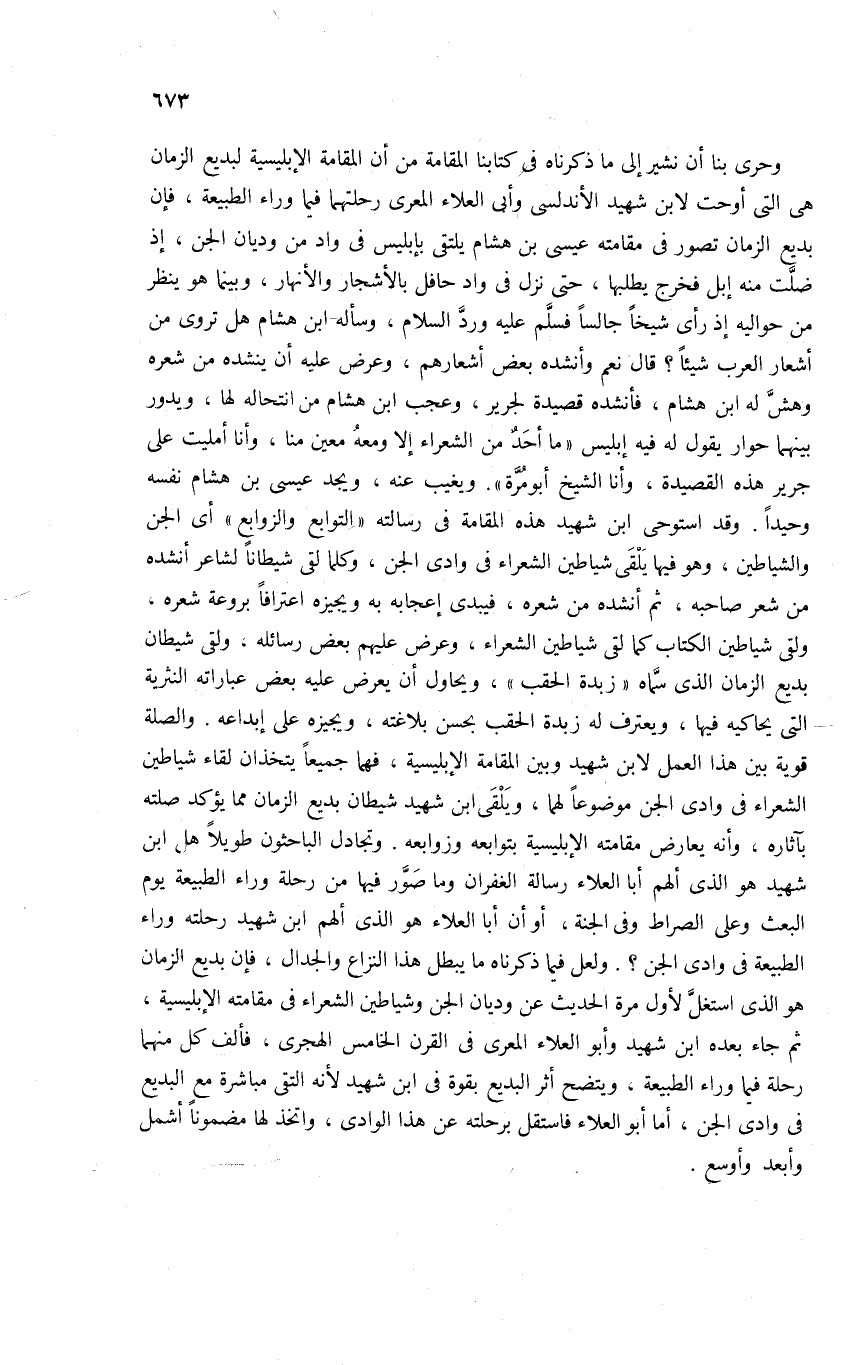 وحرى بنا أن نشير إلى ما ذكرناه فى كتابنا المقامة من أن المقامة الإبليسية لبديع الزمان هى التى أوحت لابن شهيد الأندلسى وأبى العلاء المعرى رحلتهما فيما وراء الطبيعة، فإن بديع الزمان تصور فى مقامته عيسى بن هشام يلتقى بإبليس فى واد من وديان الجن، إذ ضلّت منه إبل فخرج يطلبها، حتى نزل فى واد حافل بالأشجار والأنهار. وبينما هو ينظر من حواليه إذ رأى شيخا جالسا فسلّم عليه وردّ السلام، وسأله ابن هشام هل تروى من أشعار العرب شيئا؟ قال نعم وأنشده بعض أشعارهم، وعرض عليه أن ينشده من شعره وهشّ له ابن هشام، فأنشده قصيدة لجرير، وعجب ابن هشام من انتحاله لها، ويدور بينهما حوار يقول له فيه إبليس «ما أحد من الشعراء إلا ومعه معين منا، وأنا أمليت على جرير هذه القصيدة، وأنا الشيخ أبو مرّة». ويغيب عنه، ويجد عيسى بن هشام نفسه وحيدا. وقد استوحى ابن شهيد هذه المقامة فى رسالته «التوابع والزوابع» أى الجن والشياطين، وهو فيها يلقى شياطين الشعراء فى وادى الجن، وكلما لقى شيطانا لشاعر أنشده من شعر صاحبه، ثم أنشده من شعره، فيبدى إعجابه به ويجيزه اعترافا بروعة شعره، ولقى شياطين الكتاب كما لقى شياطين الشعراء، وعرض عليهم بعض رسائله، ولقى شيطان بديع الزمان الذى سمّاه «زبدة الحقب»، ويحاول أن يعرض عليه بعض عباراته النثرية التى يحاكيه فيها، ويعترف له زبدة الحقب بحسن بلاغته، ويجيزه على إبداعه. والصلة قوية بين هذا العمل لابن شهيد وبين المقامة الإبليسية، فهما جميعا يتخذان لقاء شياطين الشعراء فى وادى الجن موضوعا لهما، ويلقى ابن شهيد شيطان بديع الزمان مما يؤكد صلته بآثاره، وأنه يعارض مقامته الإبليسية بتوابعه وزوابعه. وتجادل الباحثون طويلا هل ابن شهيد هو الذى ألهم أبا العلاء رسالة الغفران وما صوّر فيها من رحلة وراء الطبيعة يوم البعث وعلى الصراط وفى الجنة، أو أن أبا العلاء هو الذى ألهم ابن شهيد رحلته وراء الطبيعة فى وادى الجن؟ . ولعل فيما ذكرناه ما يبطل هذا النزاع والجدال، فإن بديع الزمان هو الذى استغلّ لأول مرة الحديث عن وديان الجن وشياطين الشعراء فى مقامته الإبليسية، ثم جاء بعده ابن شهيد وأبو العلاء المعرى فى القرن الخامس الهجرى، فألف كل منهما رحلة فيما وراء الطبيعة، ويتضح أثر البديع بقوة فى ابن شهيد لأنه التقى مباشرة مع البديع فى وادى الجن، أما أبو العلاء فاستقل برحلته عن هذا الوادى، واتخذ لها مضمونا أشمل وأبعد وأوسع.
