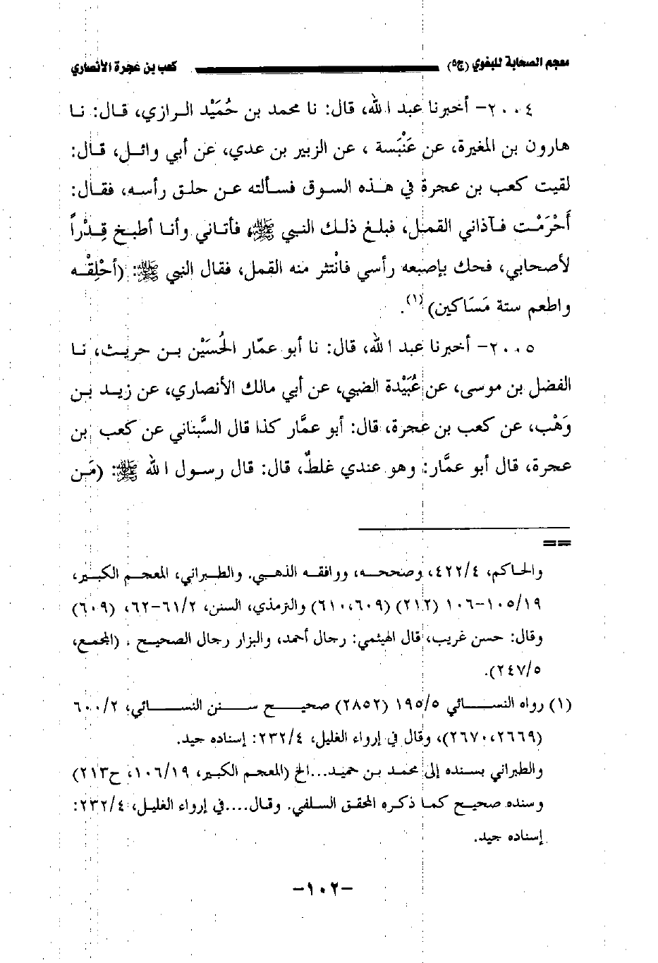 ٢٠٠٥ - أخبرنا عبد الله قال نا أبو عمار الحسين بن حريث نا الفضل بن موسى عن عبيدة الضبي عن أبي مالك الأنصاري عن زيد بن وهب عن كعب بن عجرة قال أبو عمار كذا قال السبناني عن كعب بن عجرة قال أبو عمار: وهو عندي غلط قال: قال رسول الله صلى الله عليه وسلم: " من