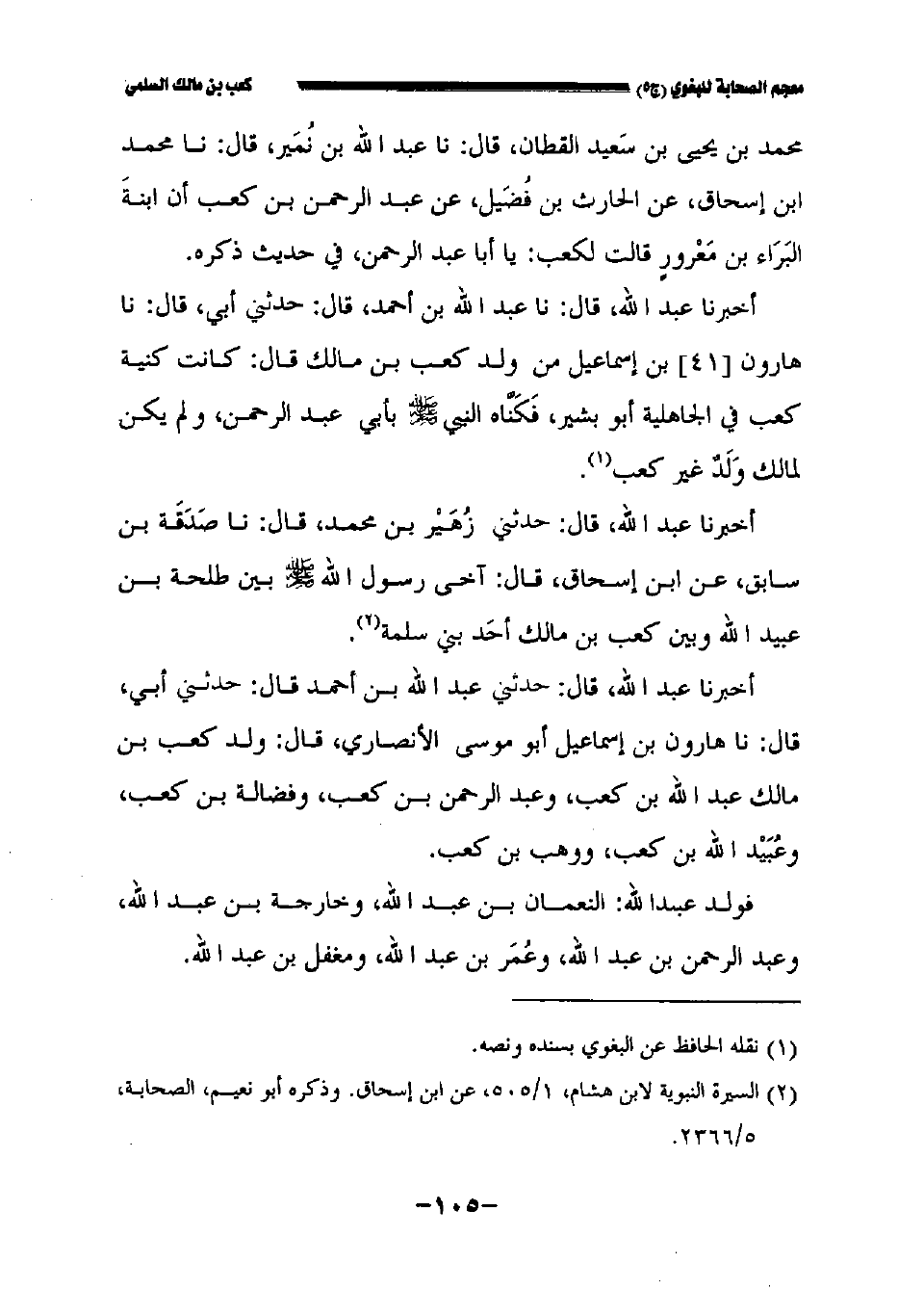 أخبرنا عبد الله قال: نا عبد الله بن أحمد قال: حدثني أبي قال: نا هارون//٤١// بن إسماعيل من ولد كعب بن مالك قال كانت كنية كعب في الجاهلية أبو بشير فكناه النبي صلى الله عليه وسلم بأبي عبد الرحمن ولم يكن لمالك ولد غير كعب.