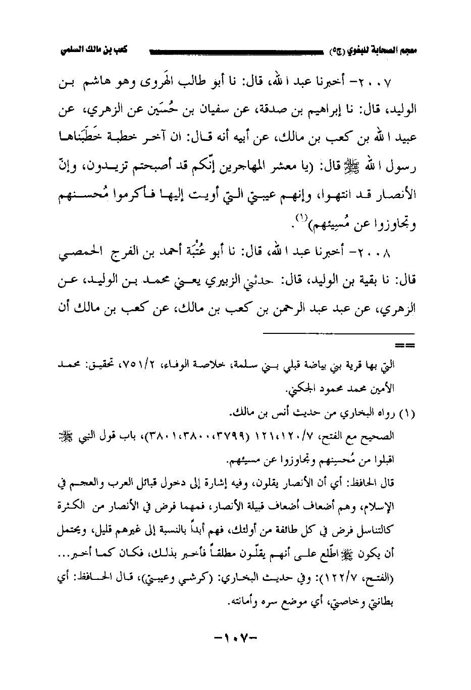 ٢٠٠٧ - أخبرنا عبد الله قال: نا أبو طالب الهروي وهو هاشم بن الوليد قال نا إبراهيم بن صدقة عن سفيان بن حسين عن الزهري عن عبيد الله بن كعب بن مالك عن أبيه أنه قال: أن آخر خطبة خطبناها رسول الله صلى الله عليه وسلم قال: " يا معشر المهاجرين إنكم قد أصبحت تزيدون وإن الأنصار قد انتهوا وإنهم عيبتي التي أويت إليها فأكرموا محسنهم وتجاوزوا عن مسيئهم.