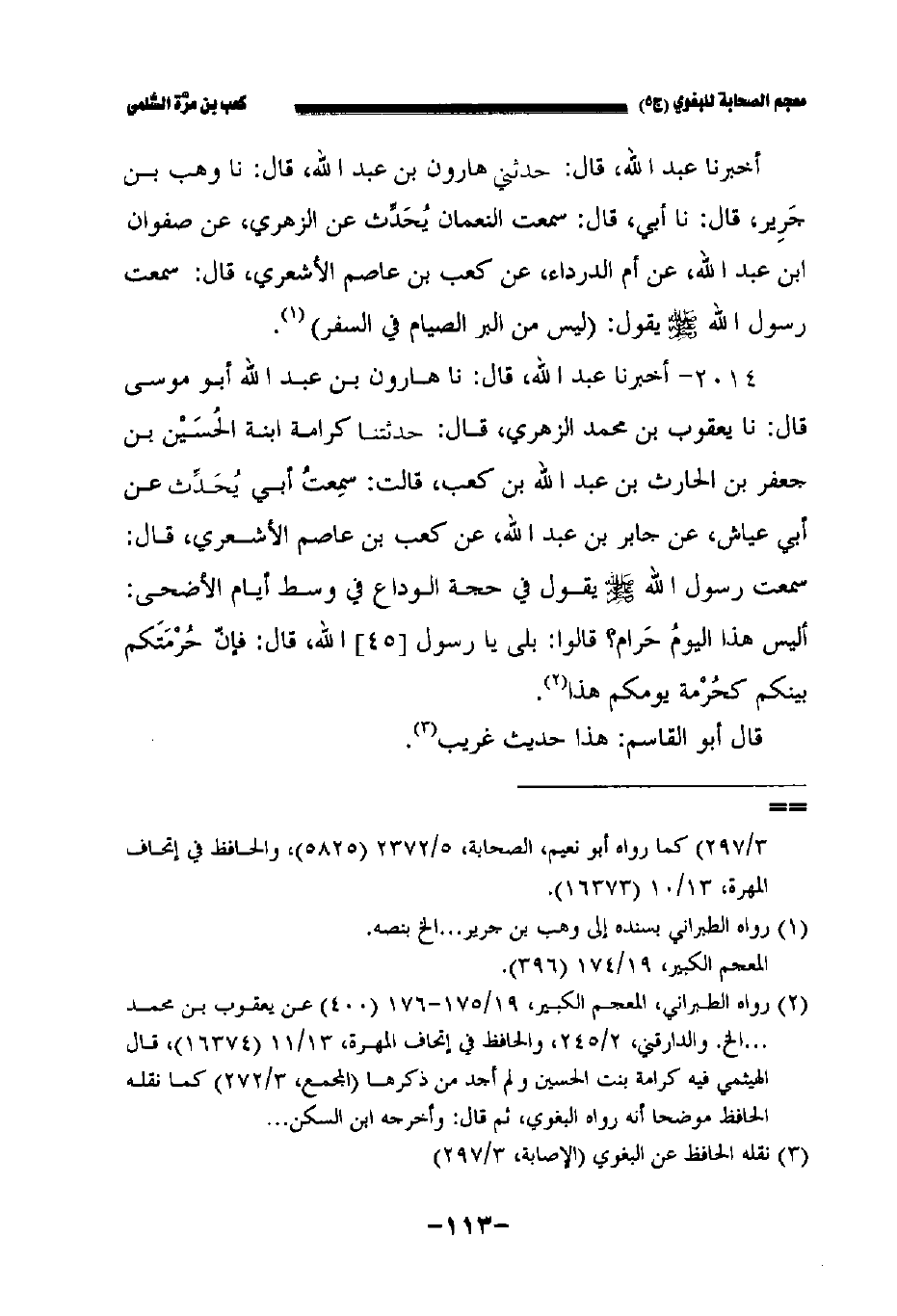 ٢٠١٤ - أخبرنا عبد الله قال: نا هارون بن عبد الله أبو موسى قال نا يعقوب بن محمد الزهري قال حدثتنا كرامة ابنة الحسين بن جعفر بن الحارث بن عبد الله بن كعب قالت: سمعت أبي يحدث عن أبي عياش عن جابر بن عبد الله عن كعب بن عاصم قال ابن كثير الأشعري قال: سمعت رسول الله صلى الله عليه وسلم يقول في حجة الوداع في وسط أيام الأضحي: أليس هذا اليوم حرام؟ قالوا: بلى يا رسول //٤٥// الله قال: فإن حرمتكم بينكم كحرمة يومكم هذا.