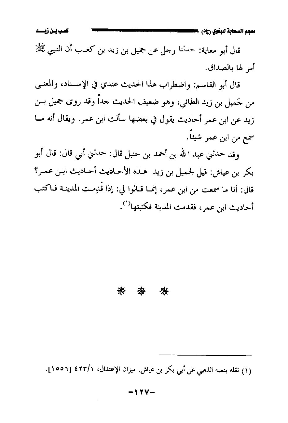 قال أبو القاسم: واضطرب هذا الحديث عندي في الإسناد والمعنى من جميل بن زيد الطائي وهو ضعيف الحديث جدا وقد روى جميل بن زيد عن ابن عمر أحاديث يقول في بعضها سألت ابن عمر. ويقال أنه ما سمع من ابن عمر شيئا.