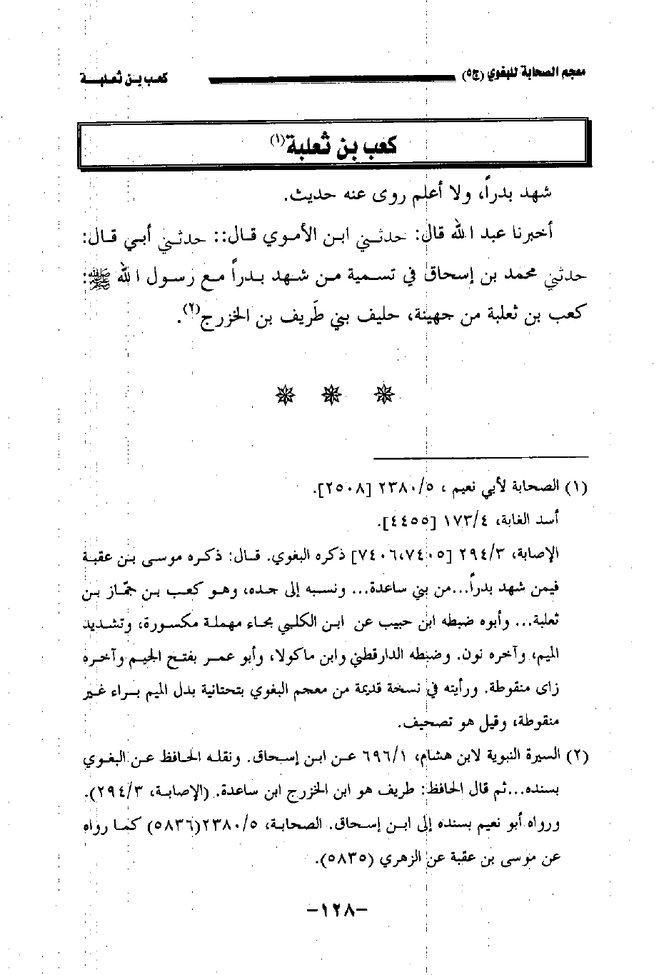 أخبرنا عبد الله قال حدثني ابن الأموي قال حدثني أبي قال: حدثني محمد بن إسحاق في تسمية من شهد بدرا مع رسول الله صلى الله عليه وسلم: كعب بن ثعلبة من جهينة حليف بني طريف بن الخزرج.