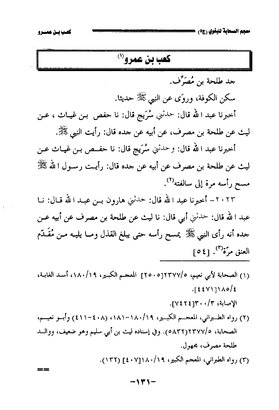٢٠٢٣ - أخبرنا عبد الله قال حدثني هارون بن عبد الله قال: نا عبد الله قال حدثني أبي قال نا ليث عن طلحة بن مصرف عن أبيه عن جده أنه رأى النبي صلى الله عليه وسلم صلى الله عليه وسلم يمسح رأسه حتى يبلغ القذل وما يليه من مقدم العنق مرة.//٥٤//