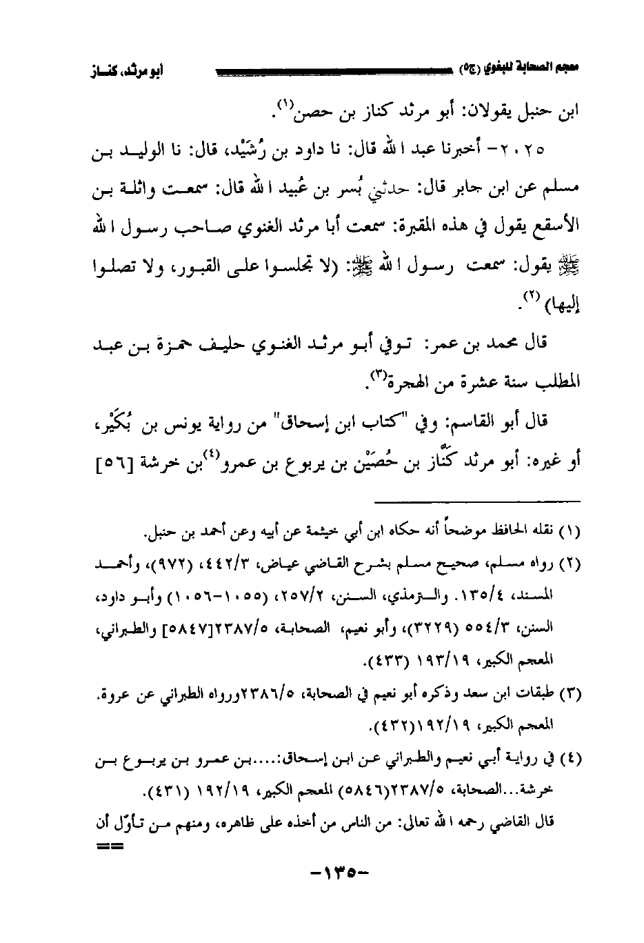 ٢٠٢٥ - أخبرنا عبد الله نا داود بن رشيد قال نا الوليد بن مسلم عن ابن جابر قال حدثني بسر بن عبيد الله قال: سمعت واثلة بن الأسقع يقول في هذه المقبرة: سمعت أبا مرثد الغنوي صاحب رسول الله صلى الله عليه وسلم: يقول: سمعت رسول الله صلى الله عليه وسلم: " لا تجلسوا على القبور ولا تصلوا إليها.