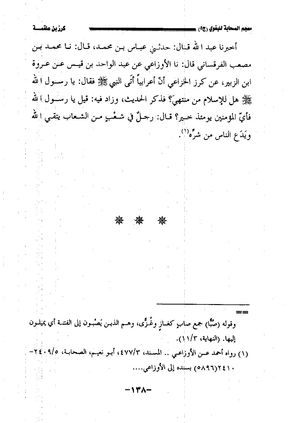 أخبرنا عبد الله قال حدثني عباس بن محمد قال نا محمد بن مصعب الفرقساني قال نا الأوزاعي عن عبد الواحد بن قيس عن عروة بن الزبير عن كرز الخزاعي أن أعرابيا أتى النبي صلى الله عليه وسلم فقال: يا رسول الله صلى الله عليه وسلم هل للإسلام من منتهى؟ فذكر الحديث وزاد فيه: قيل يا رسول الله فأي المؤمنين يومئذ خير؟ قال: رجل في شعب من الشعاب يتقي الله ويدع الناس من شره.