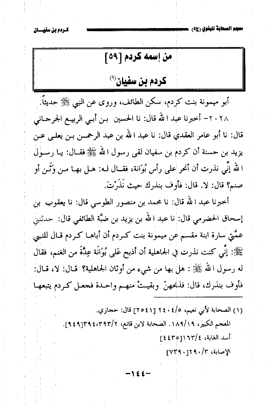 أخبرنا عبد الله قال نا محمد بن منصور الطوسي قال نا يعقوب بن إسحاق الحضرمي قال نا عبد الله بن يزيد بن ضبة الطائفي قال حدثني عمتي سارة ابنة مقسم عن ميمونة بنت كردم أن أباها كردم قال للنبي صلى الله عليه وسلم إني كنت نذرت في الجاهلية أن أذبح على بوانة عدة من الغنم فقال له رسول الله صلى الله عليه وسلم: هل بها من شيء من أوثان الجاهلية؟ قال: لا قال: فأوف بنذرك، قال: فذبحهن وبقيت منهم واحدة فجعل كردم يتبعها
