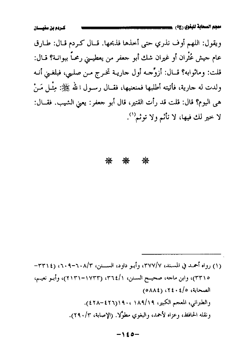 ويقول: اللهم أوف نذري حتى أخذها فذبحها. قال كردم قال طارق عام جيش عثران أو غيران شك أبو جعفر من يعطيني رمحا ببوانة؟ قال: قلت: وما ثوابه؟ قال: أزوجه أول جارية تخرج من صلبي فبلغني أنه ولدت له جارية فأتيته أطلبها فمنعنيها فقال رسول الله صلى الله عليه وسلم: مثل من هي اليوم؟ قال: قلت قد رأت القتير قال أبو جعفر: يعني الشيب. فقال: لا خير لك فيها لا تأثم ولا تؤثم.