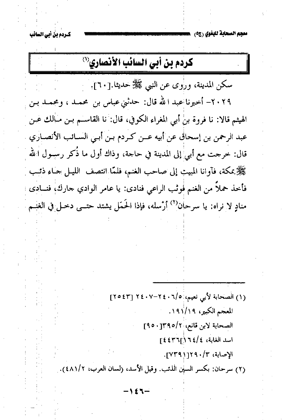 ٢٠٢٩ - أخبرنا عبد الله قال حدثني عباس بن محمد ومحمد بن الهيثم قالا: نا فروة بن أبي المغراء الكوفي قال نا القاسم بن مالك عن عبد الرحمن بن إسحاق عن أبيه عن كردم بن أبي السائب الأنصاري قال: خرجت مع أبي إلى المدينة في حاجة وذاك أول ما ذكر رسول الله صلى الله عليه وسلم بمكة فآوانا المبيت إلى صاحب الغنم فلما انتصف الليل جاء ذئب فأخذ حملا من الغنم فوثب الراعي فنادى: يا عامر الوادي جارك فنادى مناد لا نراه: يا سرحان أرسله فإذا الحمل يشتد حتى دخل في الغنم