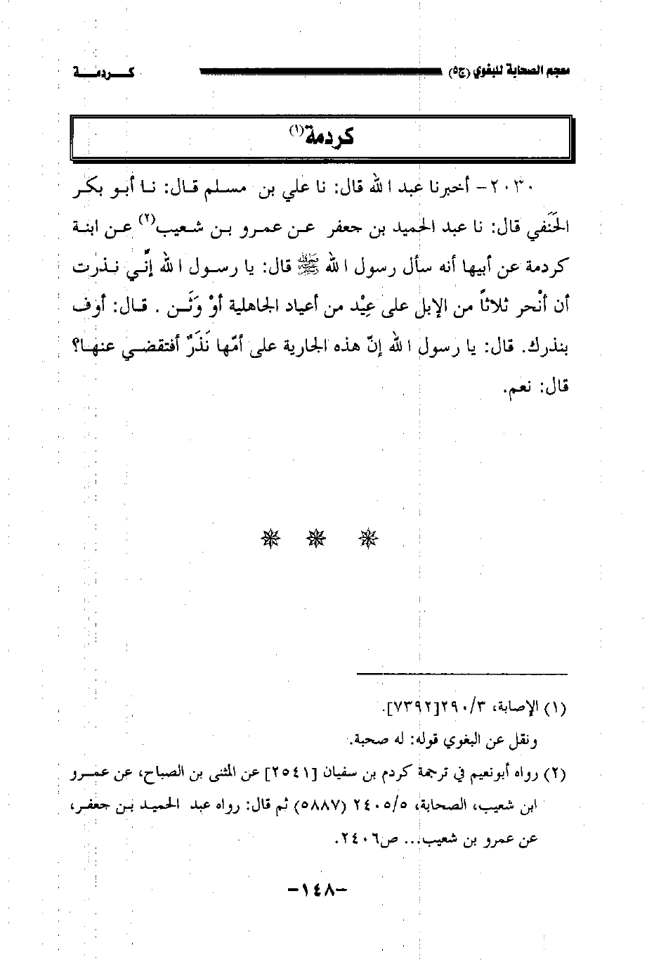 ٢٠٣٠ - أخبرنا عبد الله قال: نا علي بن مسلم قال: نا أبو بكر الحنفي قال: نا عبد الحميد بن جعفر عن عمرو بن شعيب عن ابنة كردمة عن أبيها أنه سأل رسول الله صلى الله عليه وسلم قال: يا رسول الله إني نذرت أن أنحر ثلاثا من الإبل على عيد من أعياد الجاهلية أو وثن. قال: أوف بنذرك قال: يا رسول الله إن هذه الجارية على أمها نذر أفتقضي عنها؟ قال: نعم.