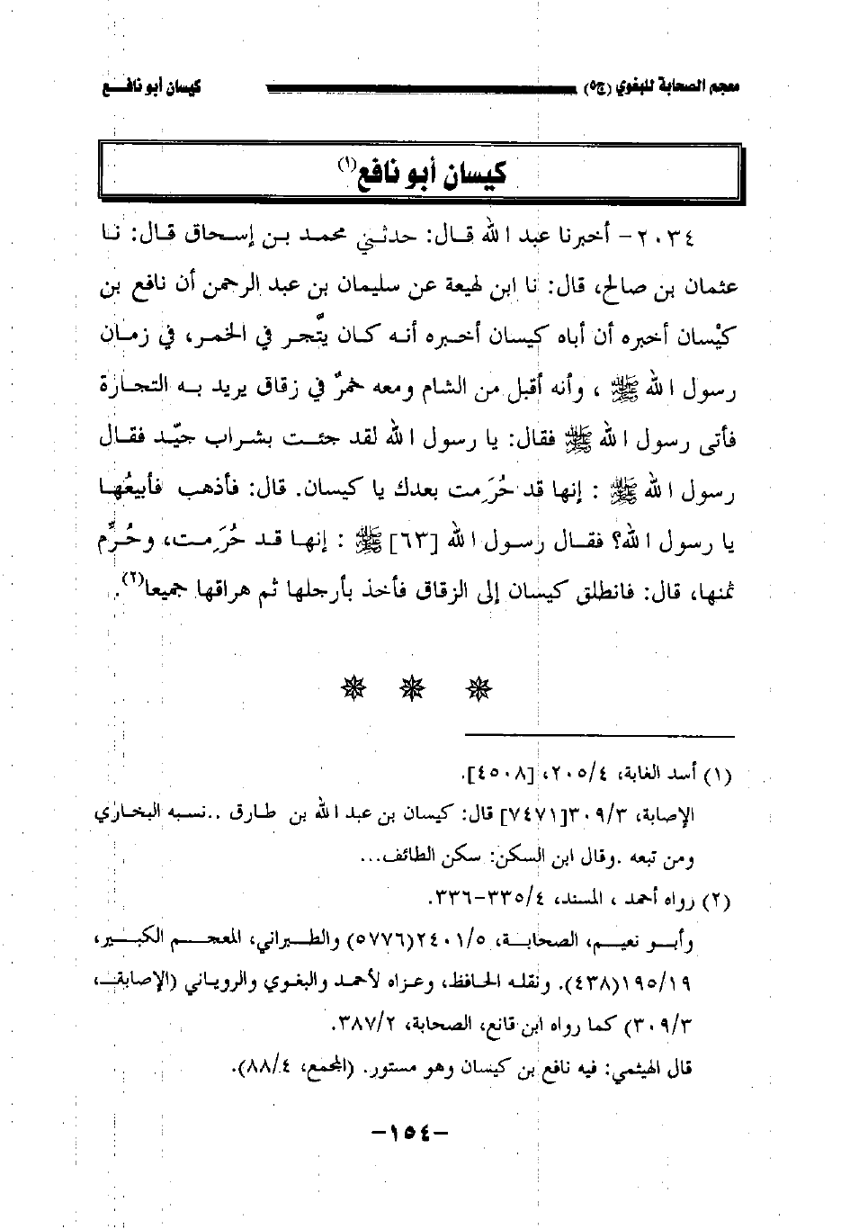٢٠٣٤ - أخبرنا عبد الله قال حدثني محمد بن إسحاق قال نا عثمان بن صالح قال نا ابن لهيعة عن سليمان بن عبد الرحمن أن نافع بن كيسان أخبره أن أباه كيسان أخبره أنه كان يتجر في الخمر في زمان رسول الله صلى الله عليه وسلم وأنه أقبل من الشام ومعه خمر في زقاق يريد به التجارة فأتى رسول الله صلى الله عليه وسلم فقال: يا رسول الله لقد جئت بشراب جيد فقال رسول الله صلى الله عليه وسلم: إنها قد حرمت بعدك يا كيسان. قال: فأذهب فأبيعها يا رسول الله؟ فقال رسول الله //٦٣// صلى الله عليه وسلم: إنها قد حرمت وحرم ثمنها، قال: فانطلق كيسان إلى الزقاق فأخذ بأرجلها ثم هراقها جميعا.