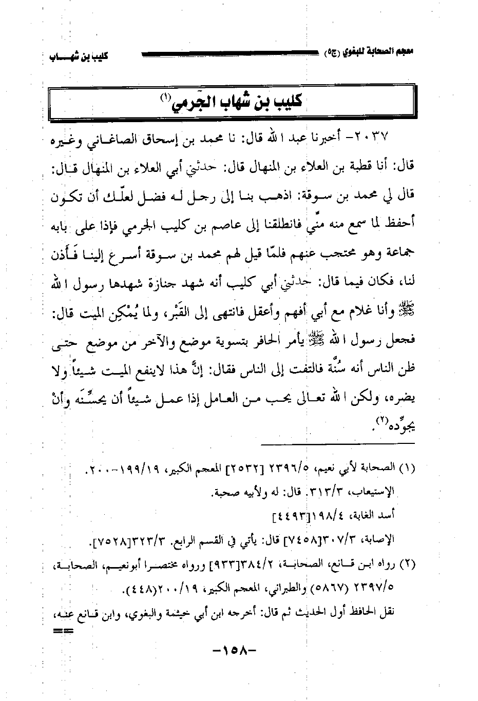 ٢٠٣٧ - أخبرنا عبد الله قال نا محمد بن إسحاق الصاغاني وغيره قال: أخبرنا قطبة بن العلاء بن المنهال قال: حدثني أبي العلاء بن المنهال قال: قال لي محمد بن سوقة: اذهب بنا إلى رجل له فضل لعلك أن تكون أحفظ لما سمع منه مني فانطلقنا إلى عاصم بن كليب الجرمي فإذا على بابه جماعة وهو محتجب عنهم فلما قيل لهم محمد بن سوقة أسرع إلينا فأذن لنا فكان فيما قال: حدثني أبي كليب أنه شهد جنازة شهدها رسول الله صلى الله عليه وسلم وأنا غلام مع أبي أفهم وأعقل فانتهى إلى القبر ولما يمكن الميت قال: فجعل رسول الله صلى الله عليه وسلم يأمر الحافر بتسوية موضع والآخر من موضع حتى ظن الناس أنه سنة فالتفت إلى الناس فقال: إن هذا لا ينفع الميت شيئا ولا يضره ولكن الله تعالى يحب من العامل إذا عمل شيئا أن يحسنه وأن يجوده.