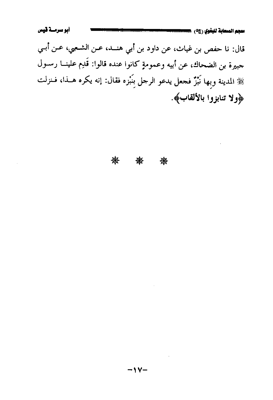 قال: نا حفص بن غياث عن داود بن أبي هند عن الشعبي عن أبي جبيرة بن الضحاك عن أبيه وعمومة كانوا عنده قالوا: قدم علينا رسول الله صلى الله عليه وسلم المدينة وبها نبز فجعل يدعو الرجل بنبزه فقال: إنه يكره هذا فنزلت {ولا تنابزوا بالألقاب}.
