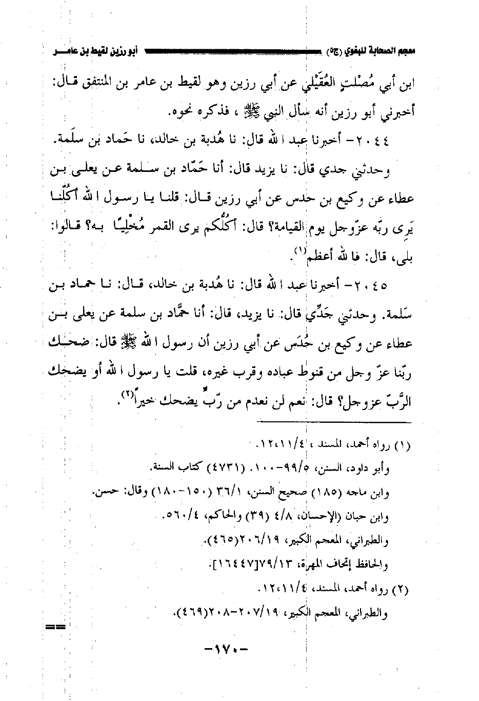 ٢٠٤٤ - أخبرنا عبد الله قال هدبة بن خالد نا حماد بن سلمة. وحدثني جدي قال: نا يزيد قال: أخبرنا حماد بن سلمة عن يعلى بن عطاء عن وكيع بن حدس عن أبي رزين قال قلنا يا رسول الله أكلنا يرى ربه عز وجل يوم القيامة؟ قال: أكلكم يرى القمر مخليا به؟ قالوا: بلى، قال: فالله أعظم.