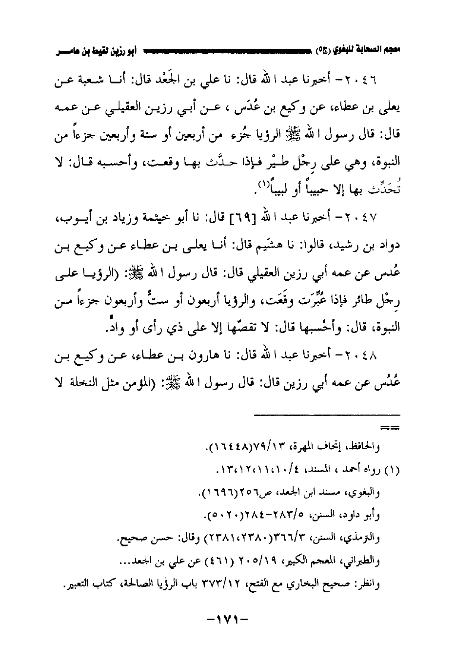 ٢٠٤٧ - أخبرنا عبد الله //٦٩// قال نا أبو خيثمة وزياد بن أيوب داود بن رشيد قالوا: نا هشيم قال أخبرنا يعلى بن عطاء عن وكيع بن عدس عن عمه أبي رزين العقيلي قال قال رسول الله صلى الله عليه وسلم: " الرؤيا على رجل طائر فإذا عبرت وقعت والرؤيا أربعون أو ست وأربعون جزءا من النبوة قال: وأحسبها قال: لا تقصها إلا على ذي رأى أو واد.