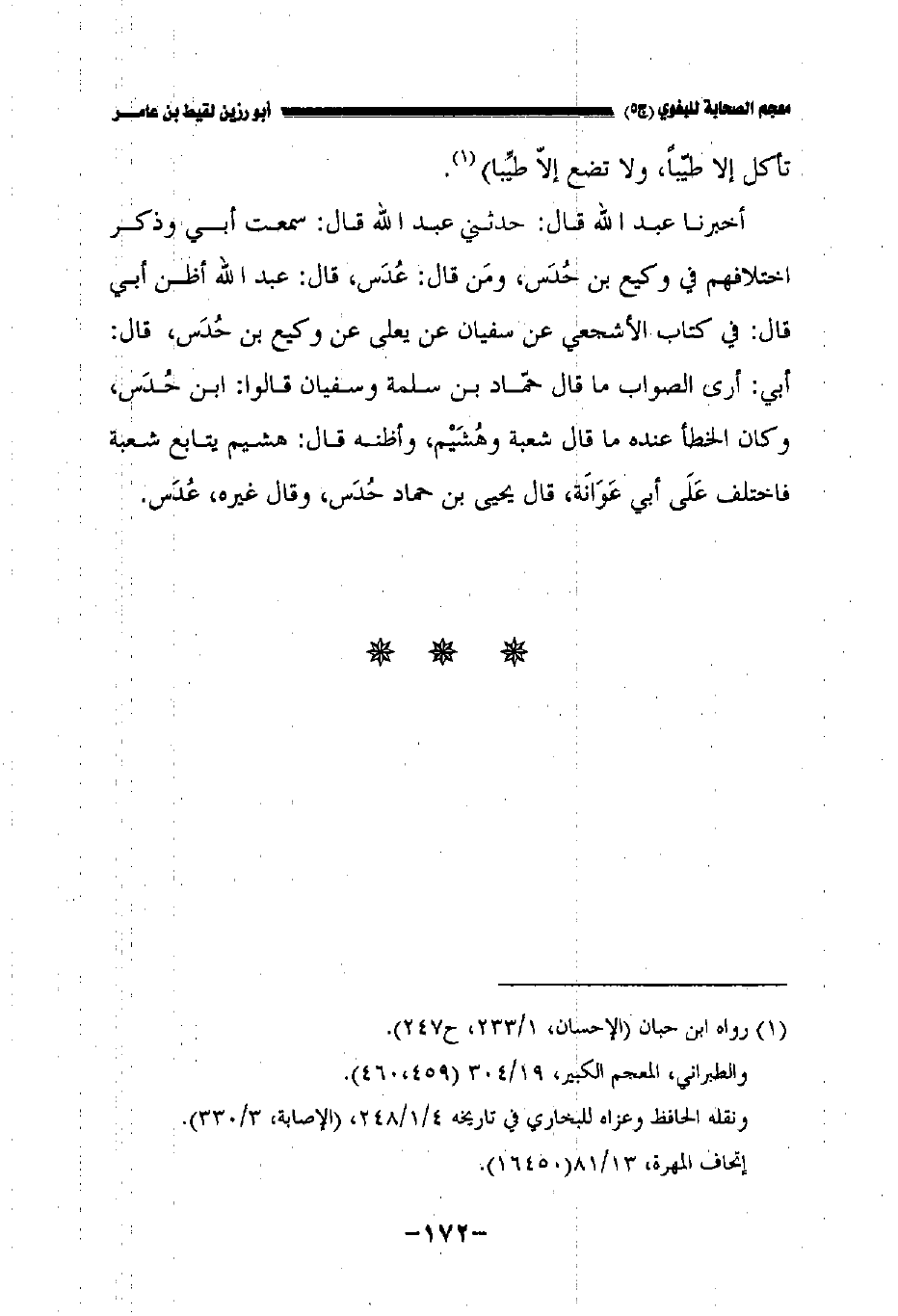 أخبرنا عبد الله قال حدثني عبد الله قال سمعت أبي وذكر اختلافهم في وكيع بن حدس ومن قال: عدس قال: عبد الله أظن أبي قال: في كتاب الأشجعي عن سفيان عن يعلى عن وكيع بن حدس قال: أبي: أرى الصواب ما قال حماد بن سلمة وسفيان قالوا: ابن حدس وكان الخطأ عنده ما قال شعبة وهشيم وأظنه قال: هشيم يتابع شعبة فاختلف على أبي عوانة قال يحيى بن حماد حدس وقال غيره عدس.