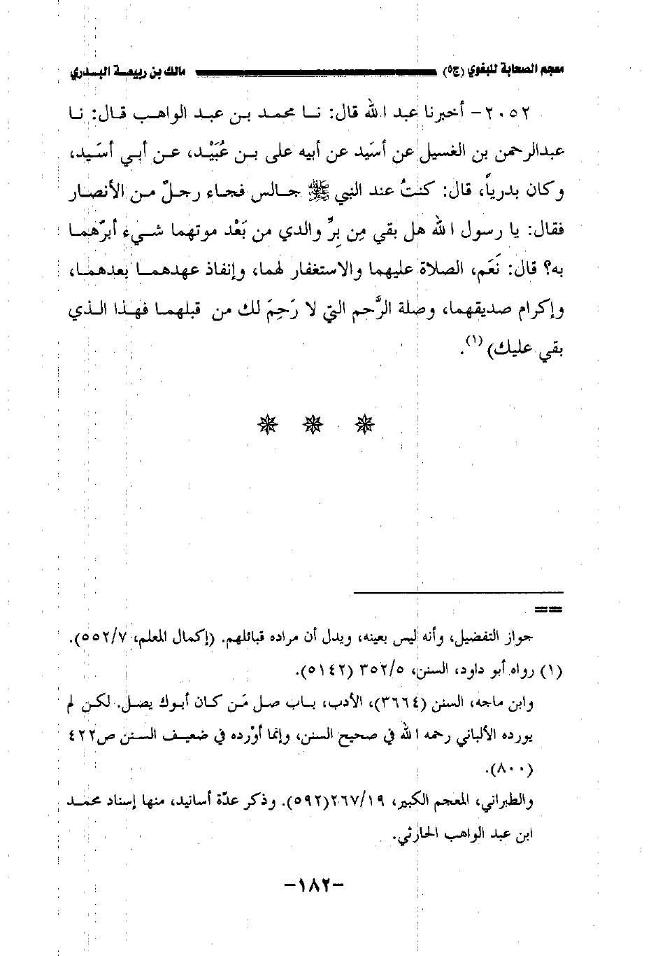 ٢٠٥٢ - أخبرنا عبد الله قال نا محمد بن عبد الواهب قال: نا عبد الرحمن بن الغسيل عن أسيد عن أبيه على بن عبيد عن أبي أسيد وكان بدريا قال: كنت عند النبي صلى الله عليه وسلم جالس فجاء رجل من الأنصار فقال: يا رسول الله هل بقي من بر والدي من بعد موتهما شيء أبرهما به؟ قال: نعم الصلاة عليهما والاستغفار لهما وإنفاذ عهدهما بعدهما وإكرام صديقهما وصلة الرحم التي لا رحم لك من قبلهما فهذا الذي بقي عليك.