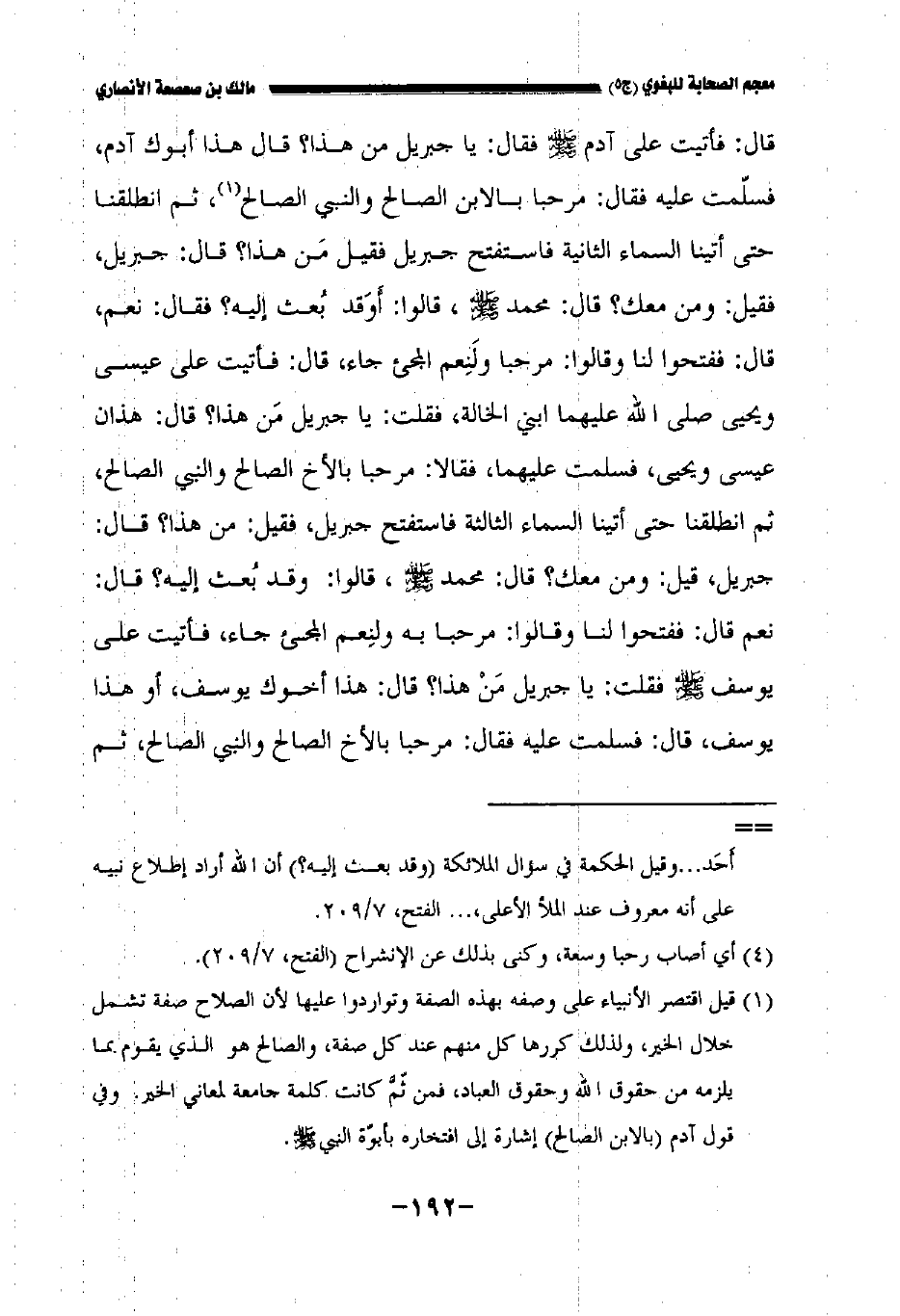 قال: فأتيت على آدم صلى الله عليه وسلم فقال: يا جبريل من هذا؟ قال هذا أبوك آدم، فسلمت عليه فقال: مرحبا بالابن الصالح والنبي الصالح ثم انطلقنا حتى أتينا السماء الثانية فاستفتح جبريل فقيل من هذا؟ قال: جبريل فقيل: ومن معك؟ قال: محمد صلى الله عليه وسلم قالوا: أوقد بعث إليه؟ فقال: نعم، قال: ففتحوا لنا وقالوا: مرحبا ولنعم المجيء جاء، قال: فأتيت على عيسى ويحيى صلى الله عليهما ابني الخالة فقلت: يا جبريل من هذا؟ قال: هذان عيسى ويحيى فسلمت عليهما فقالا: مرحبا بالأخ الصالح والنبي الصالح ثم.