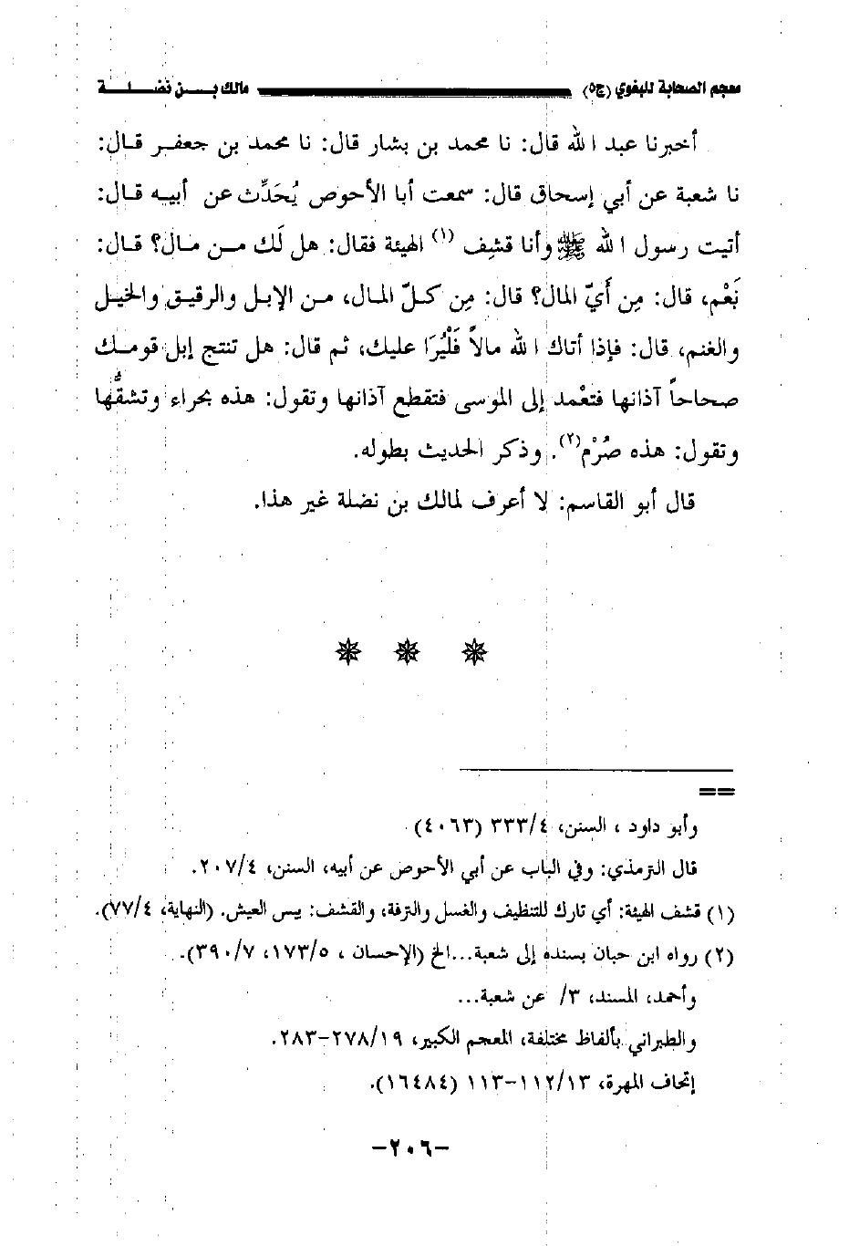 أخبرنا عبد الله قال نا محمد بن بشار قال نا محمد بن جعفر قال: نا شعبة عن أبي إسحاق قال: سمعت أبا الأحوص يحدث عن أبيه قال: أتيت رسول الله صلى الله عليه وسلم وأنا قشف الهيئة فقال: هل لك من مال؟ قال: نعم قال: من أي المال؟ قال: من كل المال من الإبل والرقيق والخيل والغنم قال: فإذا أتاك الله مالا فلير عليك ثم قال: هل تنتج إبل قومك صحاحا آذانها فتعمد إلى الموسى فتقطع آذانها وتقول: هذه بحراء وتشقها وتقول: هذه صرم. وذكر الحديث بطوله.