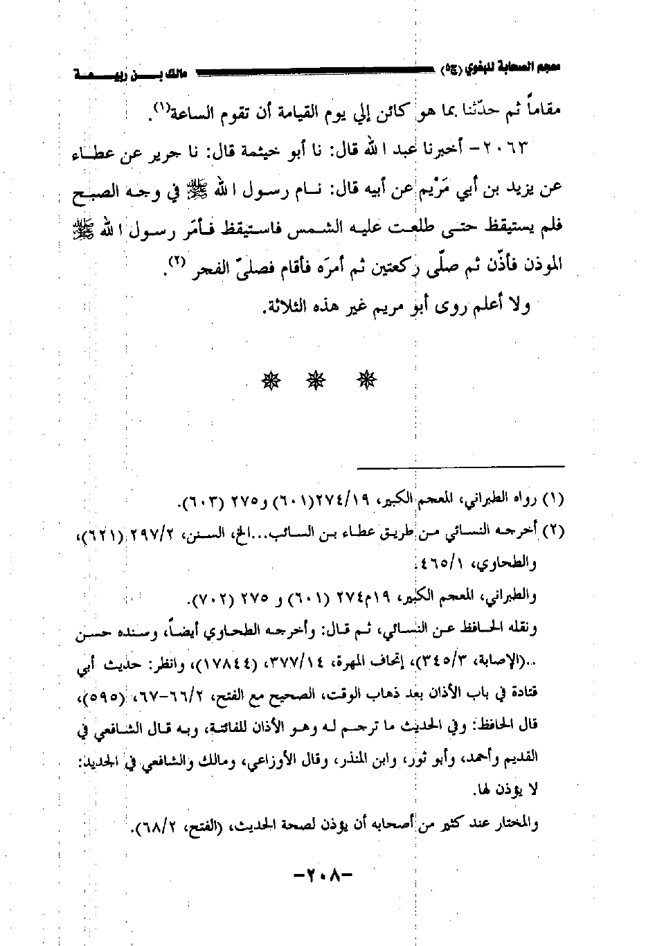 ٢٠٦٣ - أخبرنا عبد الله قال نا أبو خيثمة قال نا جرير عن عطاء عن يزيد بن أبي مريم عن أبيه قال نام رسول الله صلى الله عليه وسلم في وجه الصبح فلم يستيقظ حتى طلعت عليه الشمس فاستيقظ فأمر رسول الله صلى الله عليه وسلم المؤذن فأذن ثم صلى ركعتين ثم أمره فأقام فصلى الفجر.