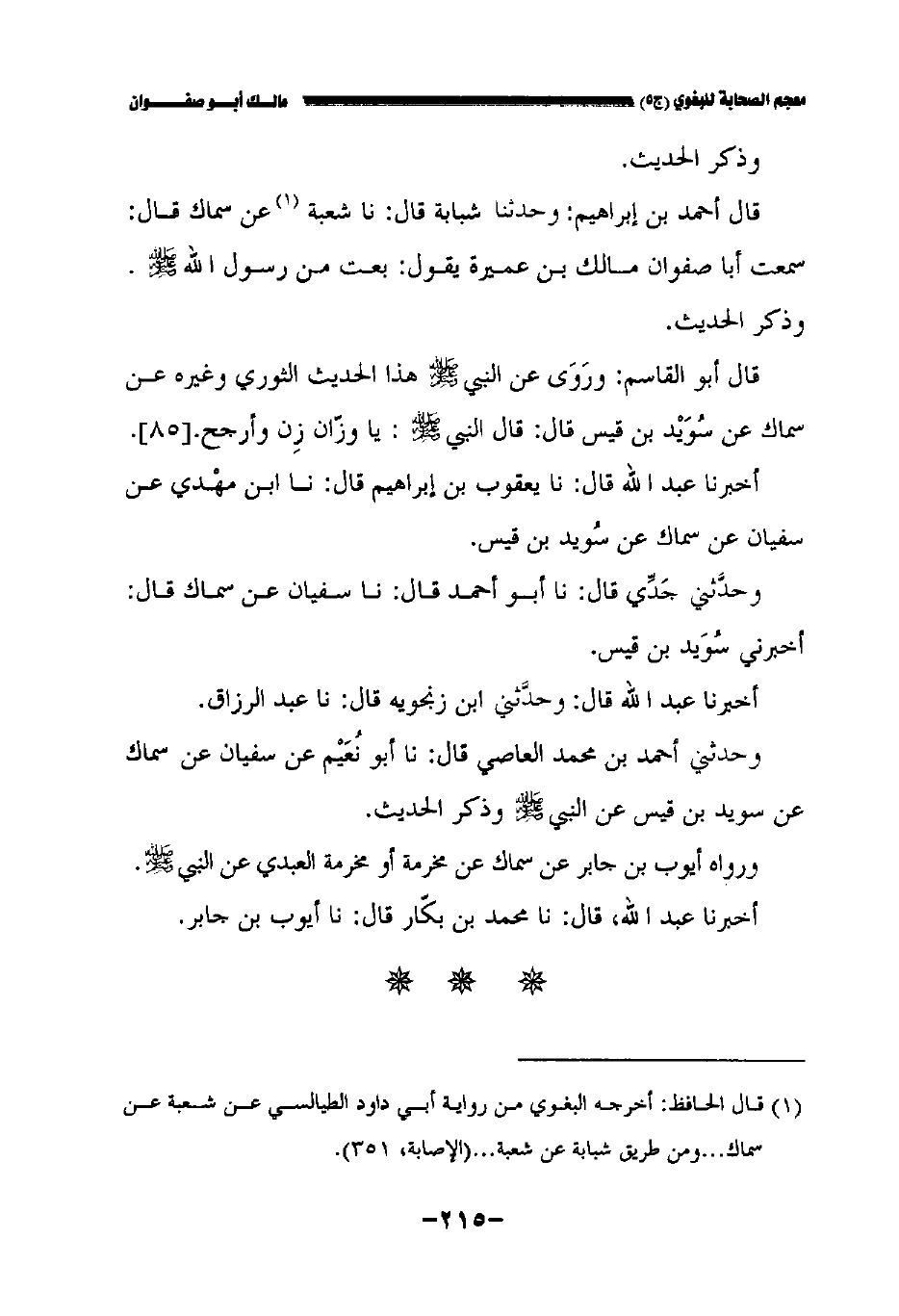 وحدثني أحمد بن محمد العاصي قال: نا أبو نعيم عن سفيان عن سماك عن سويد بن قيس عن النبي صلى الله عليه وسلم وذكر الحديث.