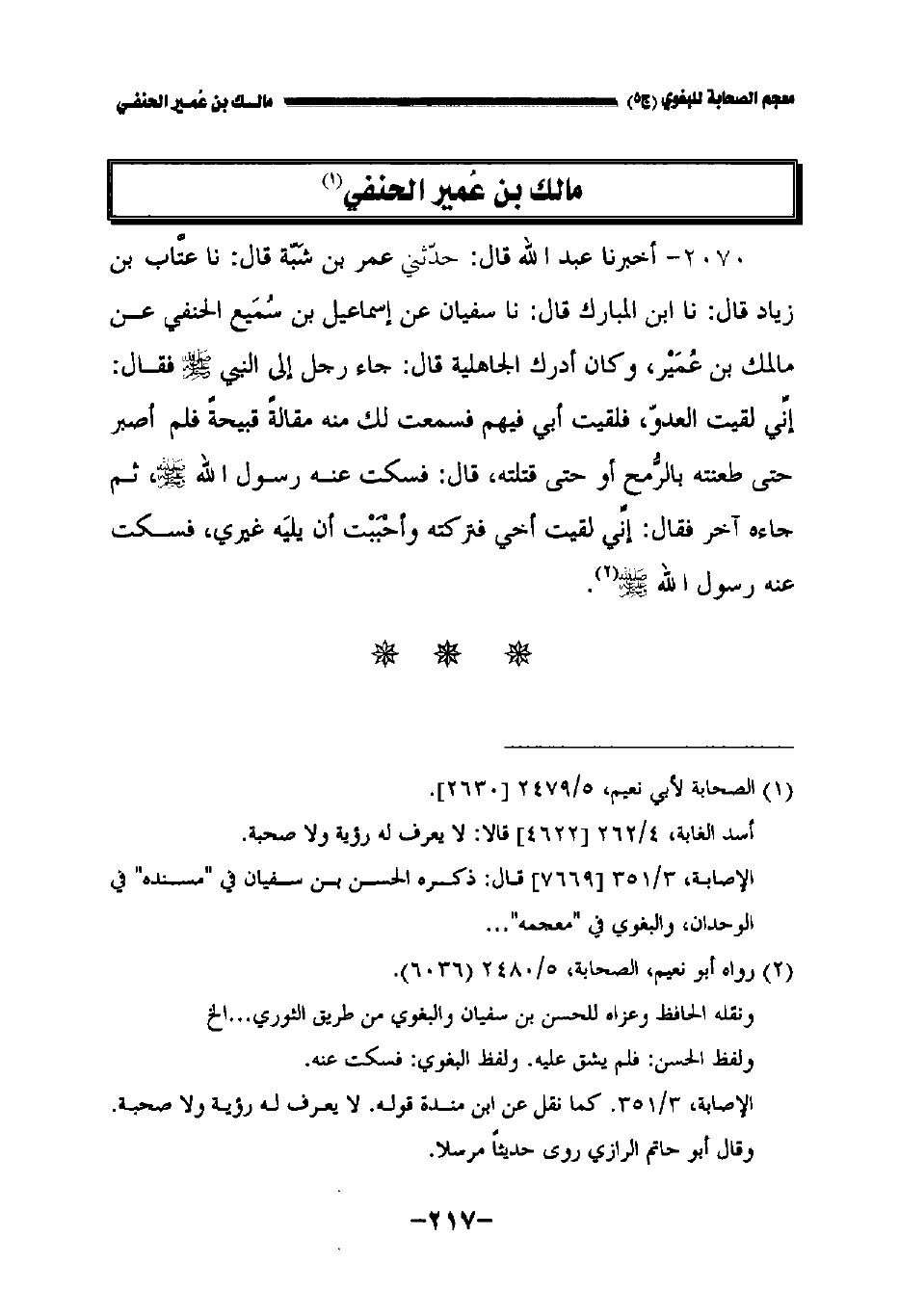 ٢٠٧٠ - أخبرنا عبد الله قال حدثني عمر بن شبة قال: نا عتاب بن زياد قال نا ابن المبارك قال نا سفيان عن إسماعيل بن سميع الحنفي عن مالك بن عمير وكان أدرك الجاهلية قال: جاء رجل إلى النبي صلى الله عليه وسلم فقال: إني لقيت العدو فلقيت أبي فيهم فسمعت لك منه مقالة قبيحة فلم أصبر حتى طعنته بالرمح أو حتى قتلته قال: فسكت عنه رسول الله صلى الله عليه وسلم ثم جاءه آخر فقال: إني لقيت أخي فتركته وأحببت أن يليه غيري فسكت عنه رسول الله صلى الله عليه وسلم.