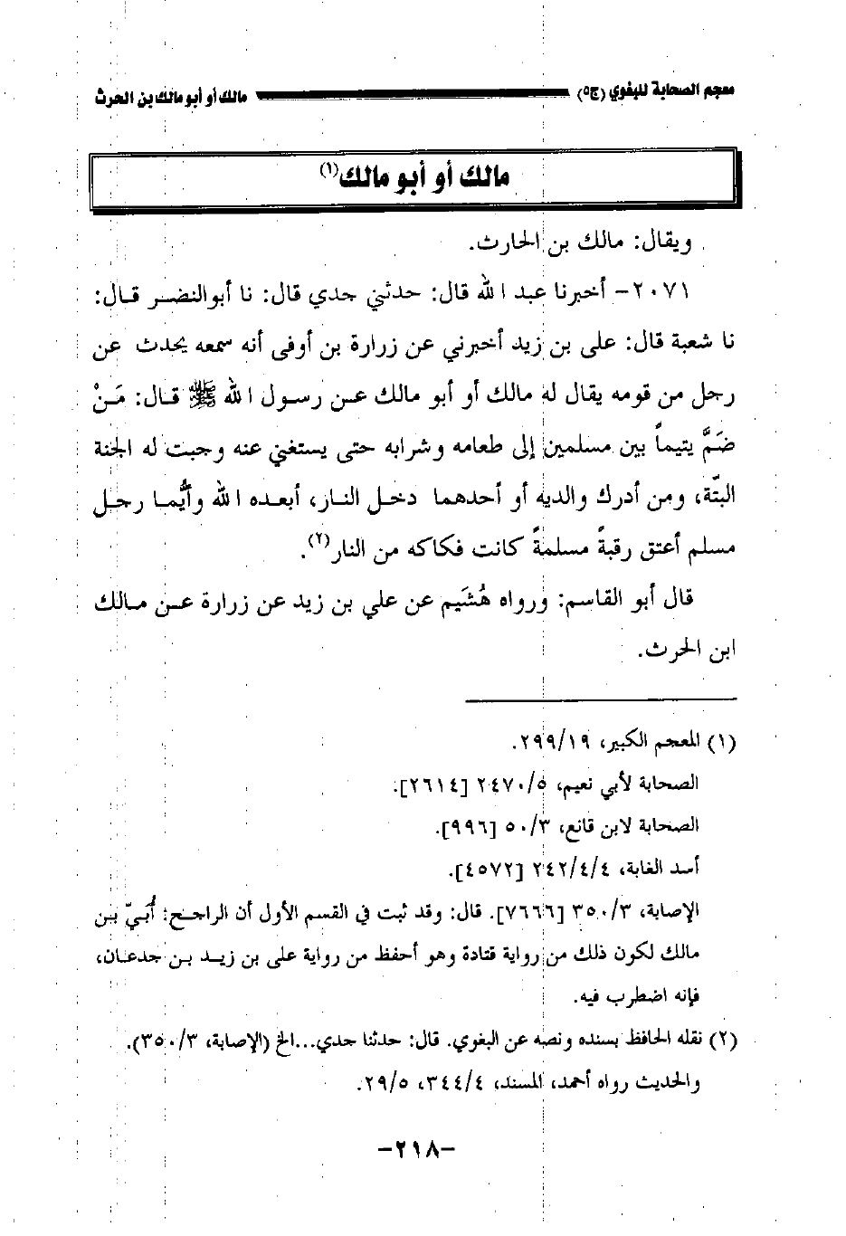 ٢٠٧١ - أخبرنا عبد الله قال حدثني جدي قال نا أبو النضر قال: نا شعبة قال علي بن زيد أخبرني عن زرارة بن أوفى أنه سمعه يحدث عن رجل من قومه يقال له مالك أو أبو مالك عن رسول الله صلى الله عليه وسلم قال: من ضم يتيما بين مسلمين إلى طعامه وشرابه حتى يستغني عنه وجبت له الجنة البتة ومن أدرك والديه أو أحدهما دخل النار، أبعده الله وأيما رجل مسلم أعتق رقبة مسلمة كانت فكاكه من النار.