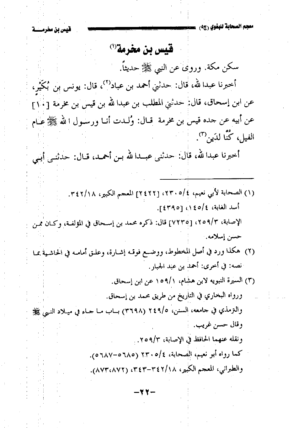 أخبرنا عبد الله قال: حدثني أحمد بن عباد قال: يونس بن بكير عن ابن إسحاق قال: حدثني المطلب بن عبد الله بن قيس بن مخرمة//١٠// عن أبيه عن جده قيس بن مخرمة قال: ولدت أنا ورسول الله صلى الله عليه وسلم عام الفيل كنا لدين.