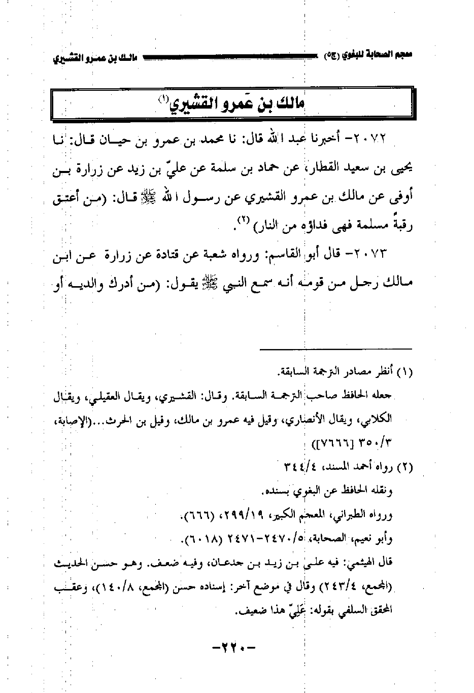 ٢٠٧٢ - أخبرنا عبد الله قال: نا محمد بن عمرو بن حيان قال: نا يحيى بن سعيد القطار عن حماد بن سلمة عن علي بن زيد عن زرارة بن أوفى عن مالك بن عمرو القشيري عن رسول الله صلى الله عليه وسلم قال: " من أعتق رقبة مسلمة فهي فداؤه من النار.