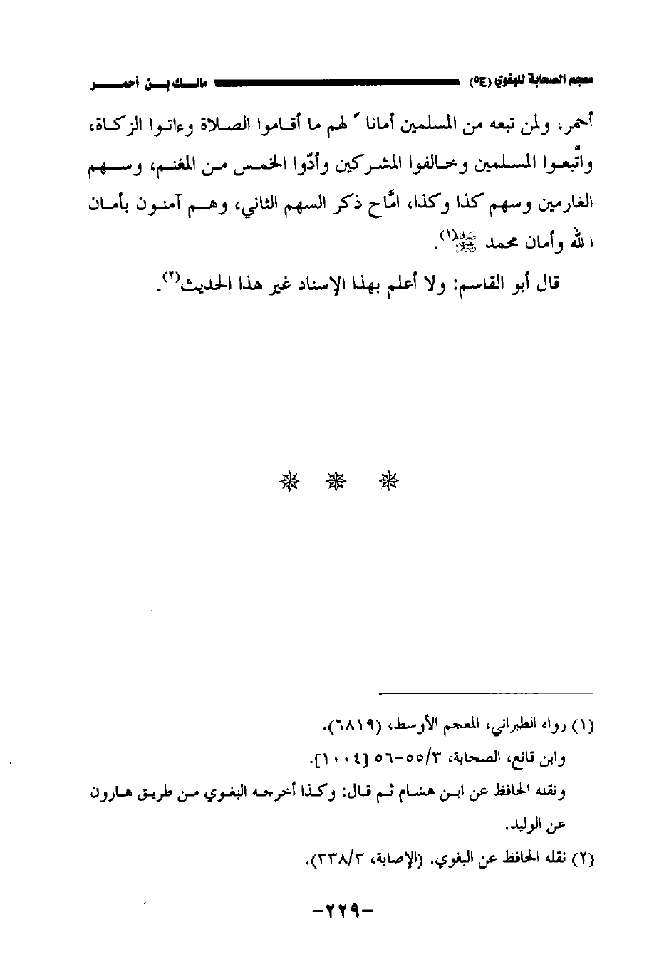 أحمر ولمن تبعه من المسلمين أمانا لهم ما أقاموا الصلاة وآتوا الزكاة واتبعوا المسلمين وخالفوا المشركين وأدوا الخمس من المغنم، وسهم الغارمين، وسهم كذا وكذا امَّاح ذكر السهم الثاني وهم آمنون بأمان الله وأمان محمد صلى الله عليه وسلم.