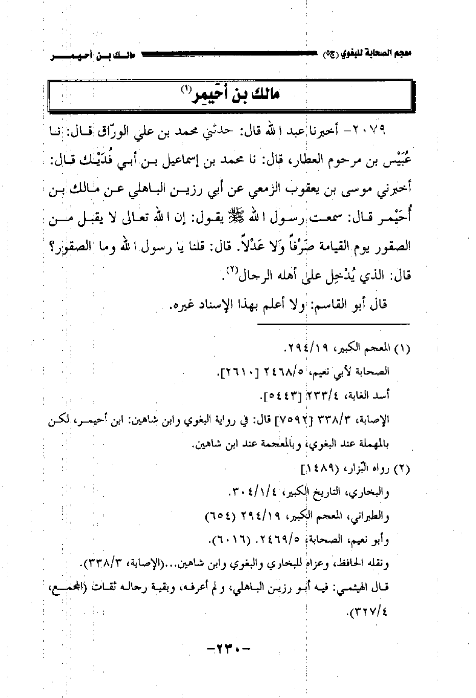 ٢٠٧٩ - أخبرنا عبد الله قال: حدثني محمد بن علي الوراق قال: حدثنا عبيس بن مرحوم العطار قال: حدثنا محمد بن إسماعيل بن أبي فديك قال: أخبرني موسى بن يعقوب الزمعي عن أبي رزين الباهلي عن مالك بن أحيمر قال: سمعت رسول الله صلى الله عليه وسلم يقول: إن الله تعالى لا يقبل من الصقور يوم القيامة صرفا ولا عدلا قال قلنا يا رسول الله وما الصقور قال الذي يدخل على أهله الرجال.