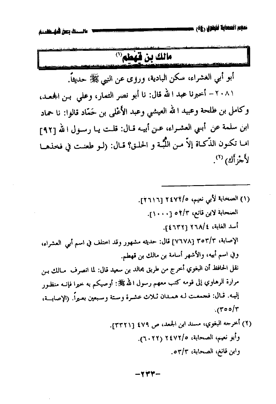٢٠٨١ - أخبرنا عبد الله قال: حدثنا أبو نصر التمار، وعلي بن الجعد، وكامل بن طلحة، وعبيد الله العيشي، وعبد الأعلى بن حماد، قالوا: حدثنا حماد بن سلمة عن أبي العشراء , عن أبيه قال قلت يا رسول الله //٩٢// أما تكون الزكاة إلا من اللبة والحلق قال لو طعنت في فخذها لأجزأك.