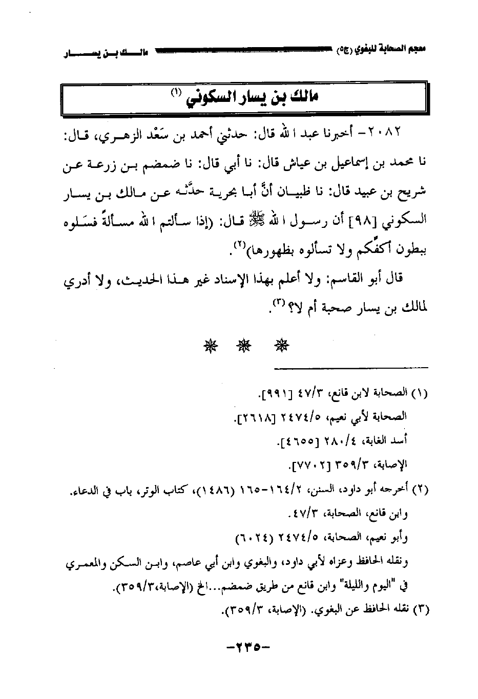 قال أبو القاسم: ولا أعلم بهذا الإسناد إلا هذا الحديث ولا أدري لمالك بن يسار صحبة أم لا.