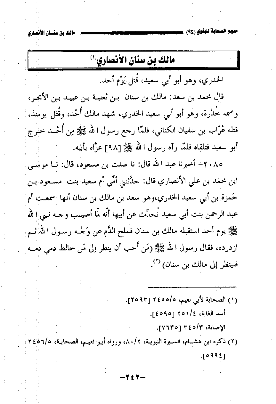 ٢٠٨٥ - أخبرنا عبد الله قال: حدثنا صلت بن مسعود قال: حدثنا موسى بن محمد بن علي الأنصاريّ قال: حدثتني أمي أم سعيد بنت مسعود بن حمزة بن أبي سعيد الخدري وهو سعد بن مالك بن سنان أنها سمعت أم عبد الرحمن بنت أبي سعيد تحدث عن أبيها أنه لما أصيب وجه نبي الله صلى الله عليه وسلم أحد استقبله مالك بن سنان فملح الدم عن وجه رسول الله صلى الله عليه وسلم ثم ازدرده فقال رسول الله صلى الله عليه وسلم من أحب أن ينظر إلى من خالط دمي دمه فلينظر إلى مالك بن سنان.