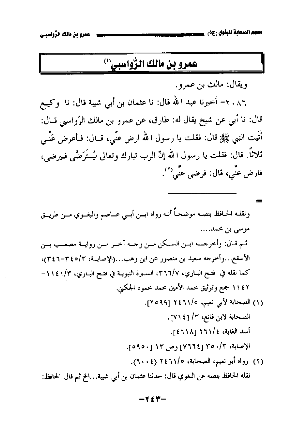 ٢٠٨٦ - أخبرنا عبد الله قال: حدثنا عثمان بن أبي شيبة قال حدثنا وكيع قال: حدثنا أبي عن شيخ يقال له طارق عن عمرو بن مالك الرواسبي قال أتيت النبي صلى الله عليه وسلم قال: فقلت يا رسول الله ارض عني قال فأعرض عني ثلاثا قال فقلت يا رسول الله إن الرب تبارك وتعالى ليترضى فيرضى فارض عني قال فرضى عني.