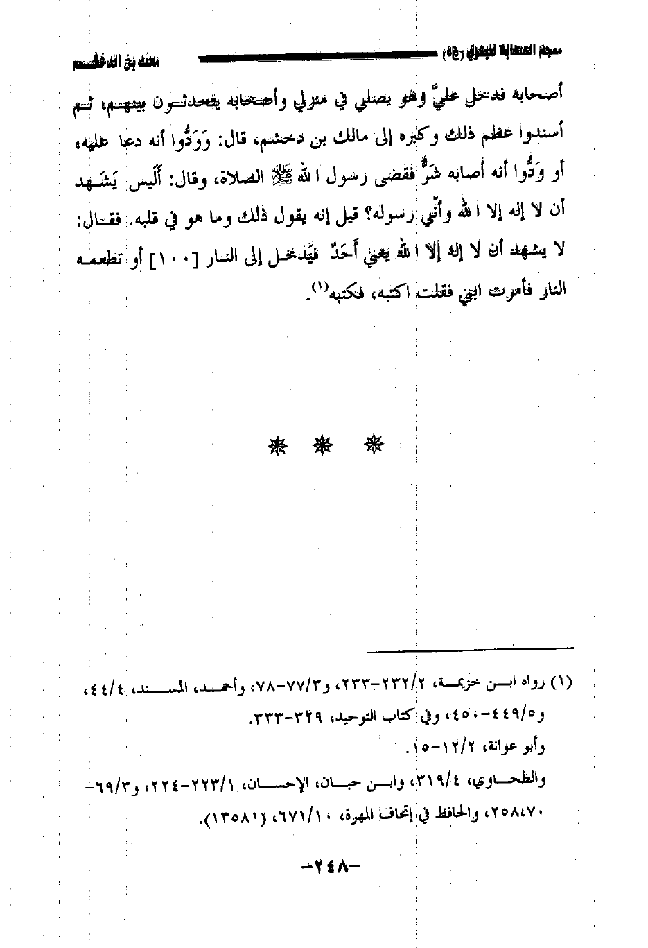 أصحابه فدخل علي وهو يصلي في منزلي وأصحابه يتحدثون بينهم ثم أسندوا عظم ذلك وكبره إلى مالك بن دخشم قال وودوا أنه دعا عليه أو ودوا أنه أصابه شر فقضى رسول الله صلى الله عليه وسلم الصلاة، وقال أليس يشهد أن لا إله إلا الله وأني رسوله قيل إنه يقول ذلك وما هو في قلبه فقال لا يشهد أن لا إله إلا الله يعني أحد فيخل النار //١٠٠// أو تطعمه النار فأمرت ابني فقلت اكتبه فكتبه.