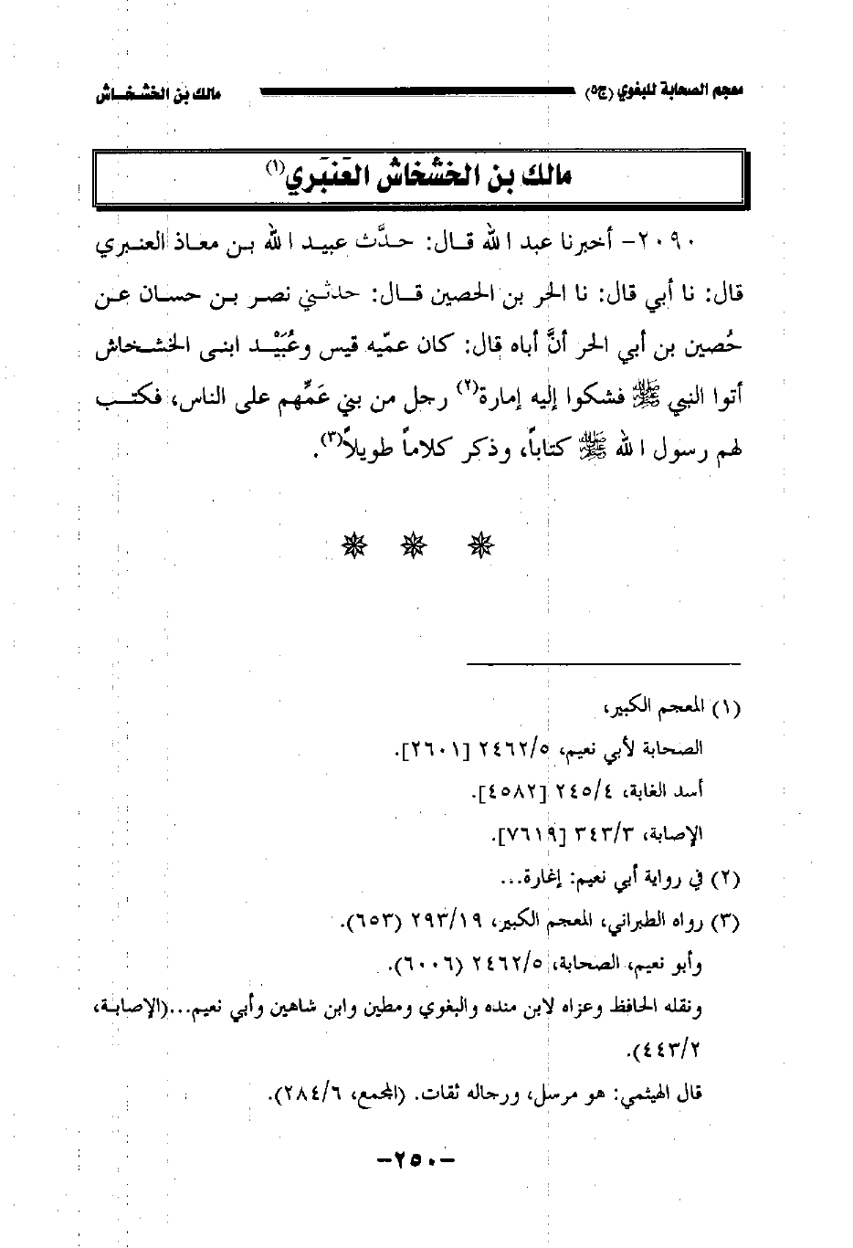 ٢٠٩٠ - أخبرنا عبد الله قال: حدث عبيد الله بن معاذ العنبري قال: حدثنا أبي قال: حدثنا الحر بن الحصين قال: حدثني نصر بن حسان عن حصين بن أبي الحر أن أباه قال كان عميه قيس، وعبيد ابني الخشخاش أتوا النبي صلى الله عليه وسلم فشكوا إليه إمارة رجل من بني عمهم على الناس فكتب لهم رسول الله صلى الله عليه وسلم كتابا وذكر كلاما طويلا.
