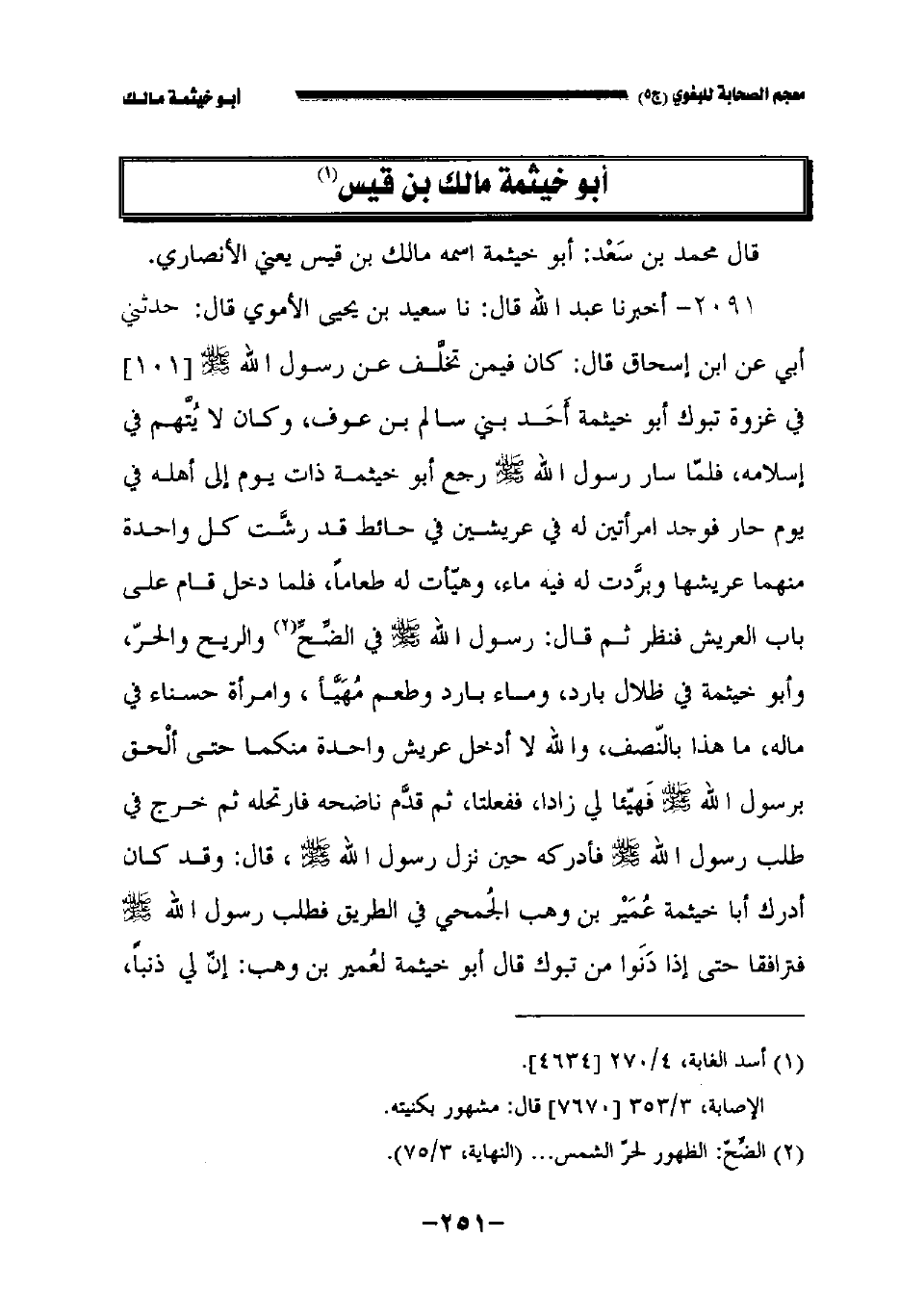 ٢٠٩١ - أخبرنا عبد الله قال: حدثنا سعيد بن يحيى الأموي قال: حدثني أبي عن ابن إسحاق قال كان فيمن تخلف عن رسول الله صلى الله عليه وسلم //١٠١//في غزوة تبوك أبو خيثمة أحد بني سالم بن عوف وكان لا يتهم في إسلامه فلما سار رسول الله صلى الله عليه وسلم رجع أبو خيثمة ذات يوم إلى أهله في يوم حار فوجد امرأتين له في عريشين في حائط قد رشت كل واحدة منهما عريشها، وبردت له فيه ماء، وهيأت له طعاما فلما دخل قام على باب العريش فنظر , ثم قال: رسول الله صلى الله عليه وسلم في الضح والريح، والحر، وأبو خيثمة في ظل بارد، وماء بارد، وطعام مهيأ، وامرأة حسناء ما هذا بالنصف والله لا أدخل عريش واحدة منكما حتى ألحق برسول الله صلى الله عليه وسلم فهيئا لي زادا ففعلتا ثم قدم ناضحه فارتحل ثم خرج في طلب رسول الله صلى الله عليه وسلم حتى أدركه حين نزل رسول الله صلى الله عليه وسلم، قال: وقد كان أدرك أبا خيثمة عمير بن وهب الجمحي في الطريق فطلب رسول الله صلى الله عليه وسلم فترافقا حتى إذا دنوا من تبوك قال أبو خيثمة لعمير بن وهب: إن لي ذنبا