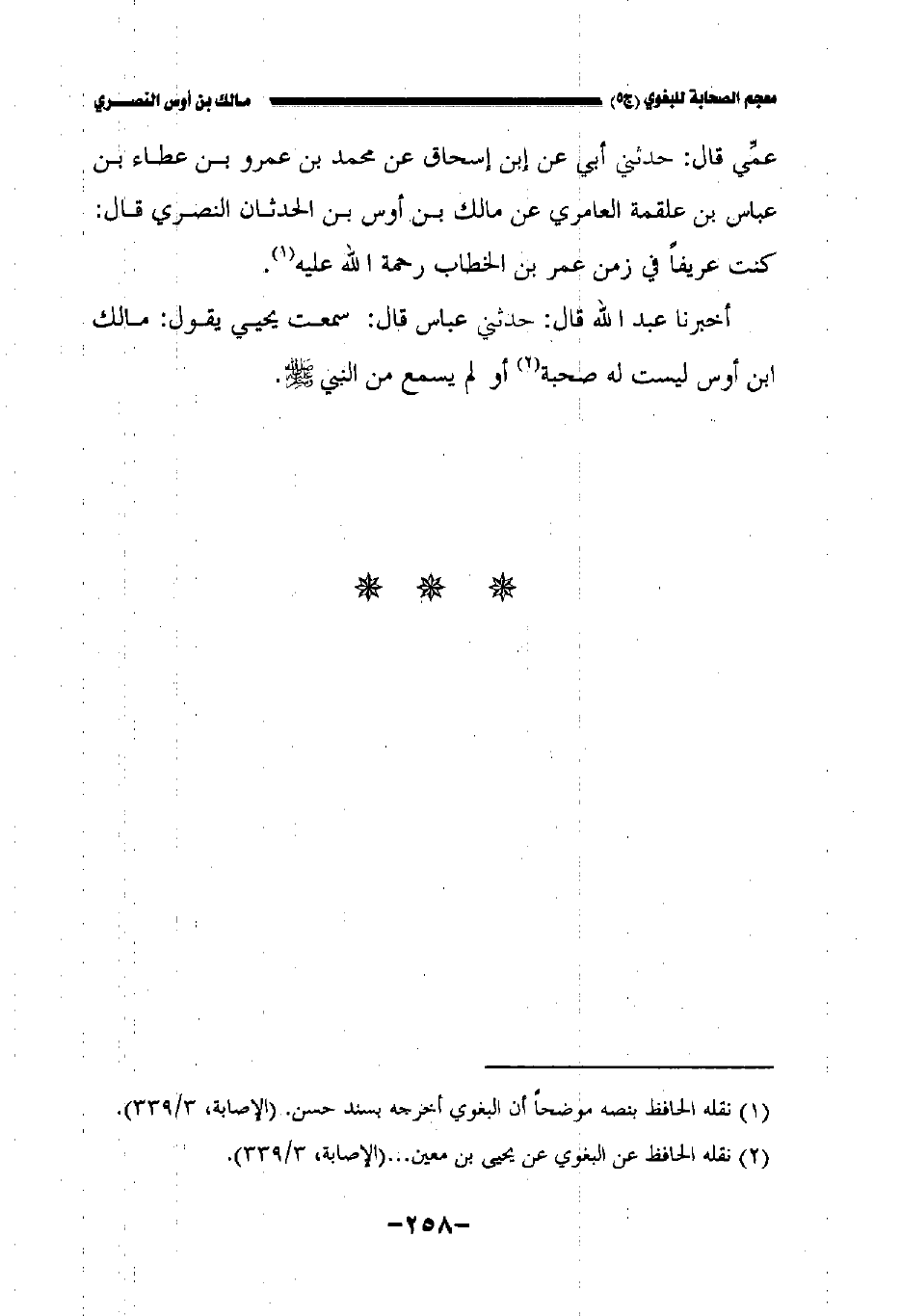 أخبرنا عبد الله قال: حدثني عباس قال: سمعت يحيى يقول مالك بن أوس ليست له صحبة أو لم يسمع من النبي صلى الله عليه وسلم.