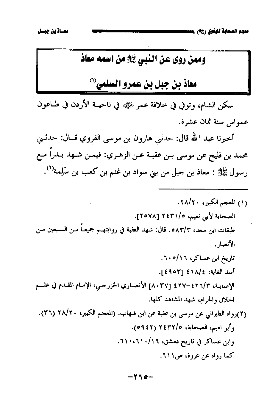 أخبرنا عبد الله قال: حدثني هارون بن موسى الفروي قال: حدثني محمد بن فليح عن موسى بن عقبة عن الزهري فيمن شهد بدرا مع رسول الله صلى الله عليه وسلم معاذ بن جبل من بني سواد بن غنم بن كعب بن سلمة.
