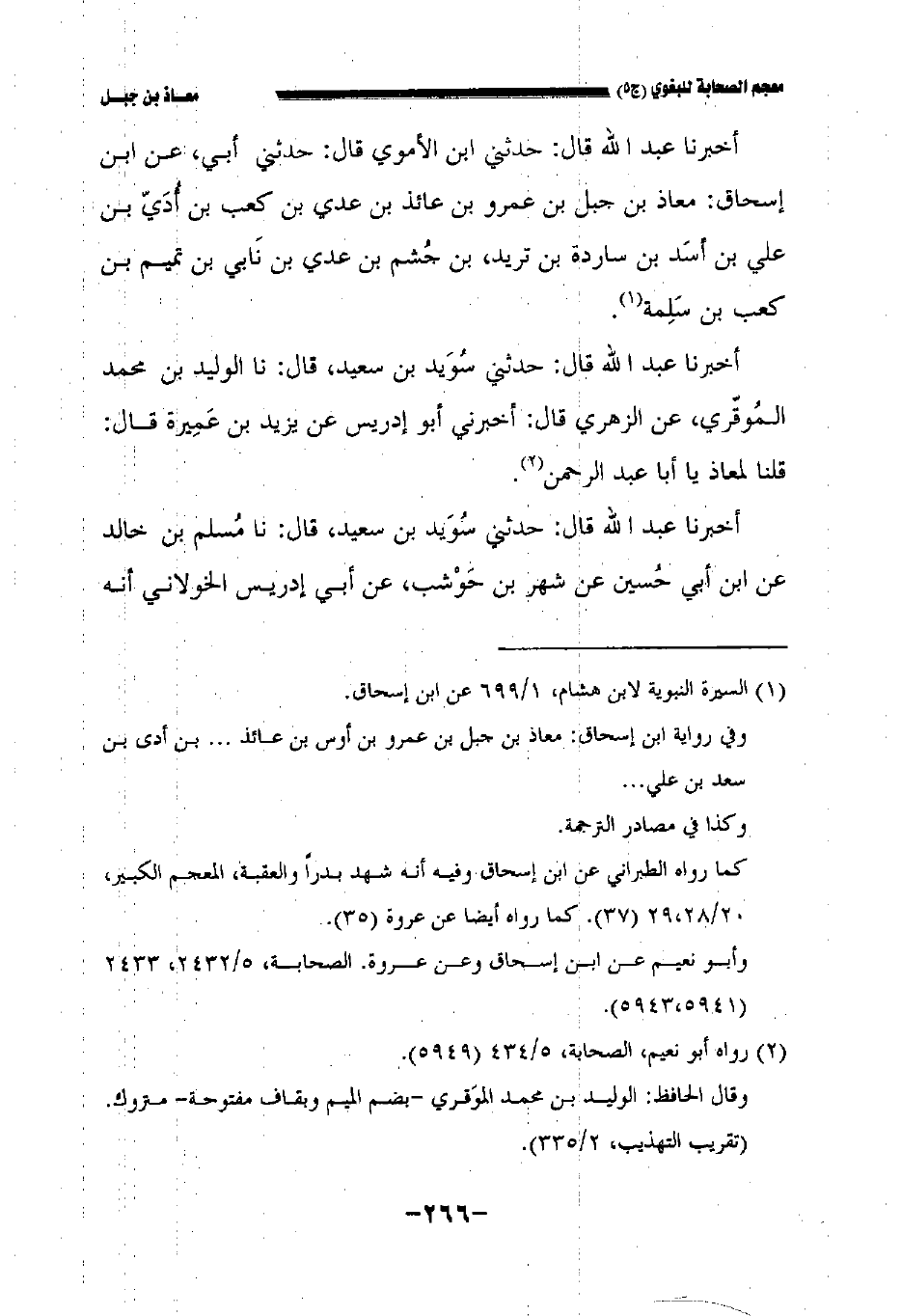أخبرنا عبد الله قال: حدثني سويد بن سعيد قال: حدثنا الوليد بن محمد الموقري عن الزهري قال: أخبرني أبو إدريس عن يزيد بن عميرة قال قلنا لمعاذ يا أبا عبد الرحمن.