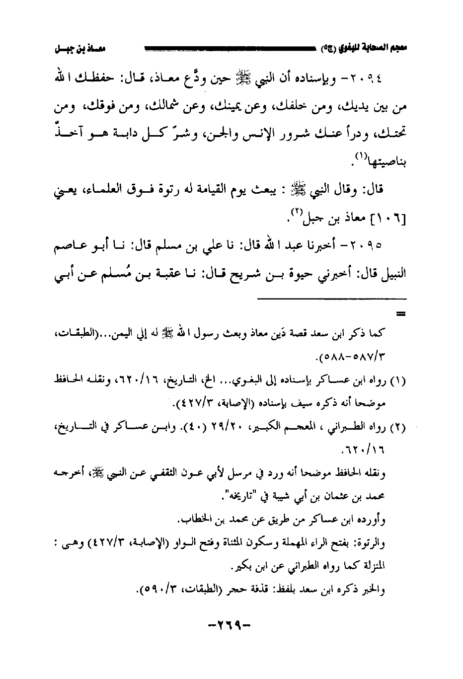 ٢٠٩٤ - وبإسناده أن النبي صلى الله عليه وسلم حين ودع معاذ قال حفظك الله من بين يديك ومن خلفك وعن يمينك وعن شمالك ومن فوقك ومن تحتك ودرأ عنك شرور الإنس والجن وشر كل دابة هو آخذ بناصيتها.