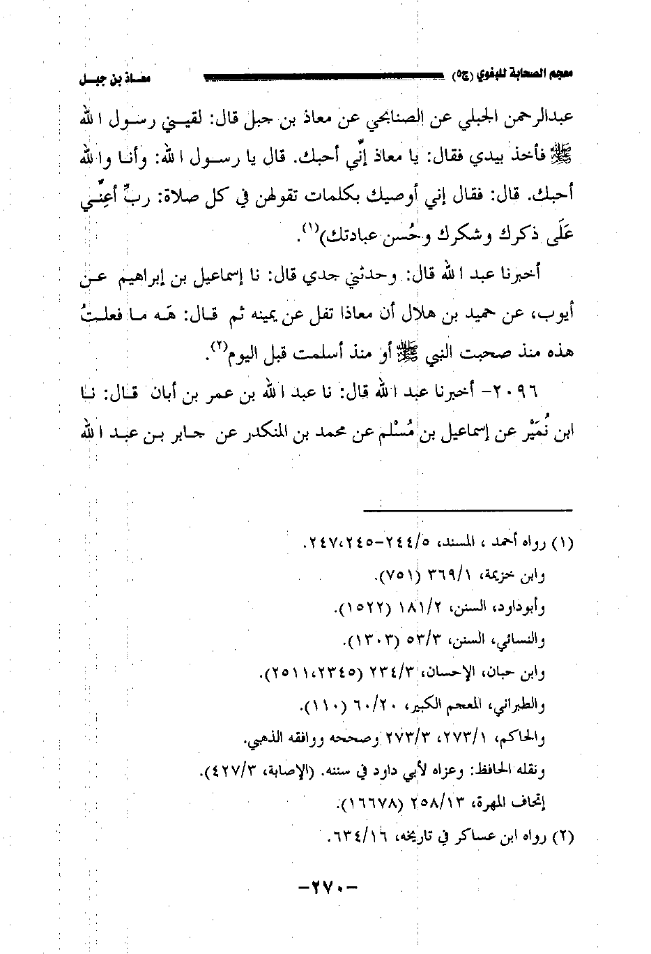 عبد الرحمن الجبلي عن الصنابحي عن معاذ بن جبل قال لقيني رسول الله صلى الله عليه وسلم فأخذ بيدي فقال يا معاذ إني أحبك قال يا رسول الله وأنا والله قال فقال إني أصيك بكلمات تقولهن في كل صلاة رب أعني رعلى ذكرك وشكرك وحسن عبادتك.