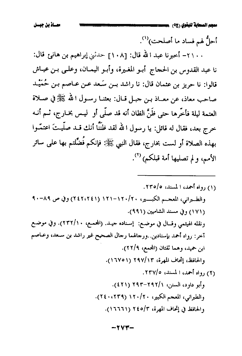 ٢١٠٠ - أخبرنا عبد الله قال: //١٠٨//حدثني إبراهيم بن هانىء قال: حدثنا عبد القدوس بن الحجاج أبو المغيرة وأبو اليمان وعلي بن عياش قالوا حدثنا حريز بن عثمان قال: حدثنا راشد بن سعد عن عاصم بن حميد صاحب معاذ عن معاذ بن جبل رضي الله عنه , قال بعثنا رسول الله صلى الله عليه وسلم في صلاة العتمة ليلة فأخرها حتى ظن الظان أنه قد صلى أو ليس بخارج , ثم إنه خرج بعد فقال له قائل يا رسول الله لقد ظننا أنك قد صليت اعتموا بهذه الصلاة أو لست بخارج فقال النبي صلى الله عليه وسلم فإنكم فضلتم بها على سائر الأمم ولم تصليها أمة قبلكم.