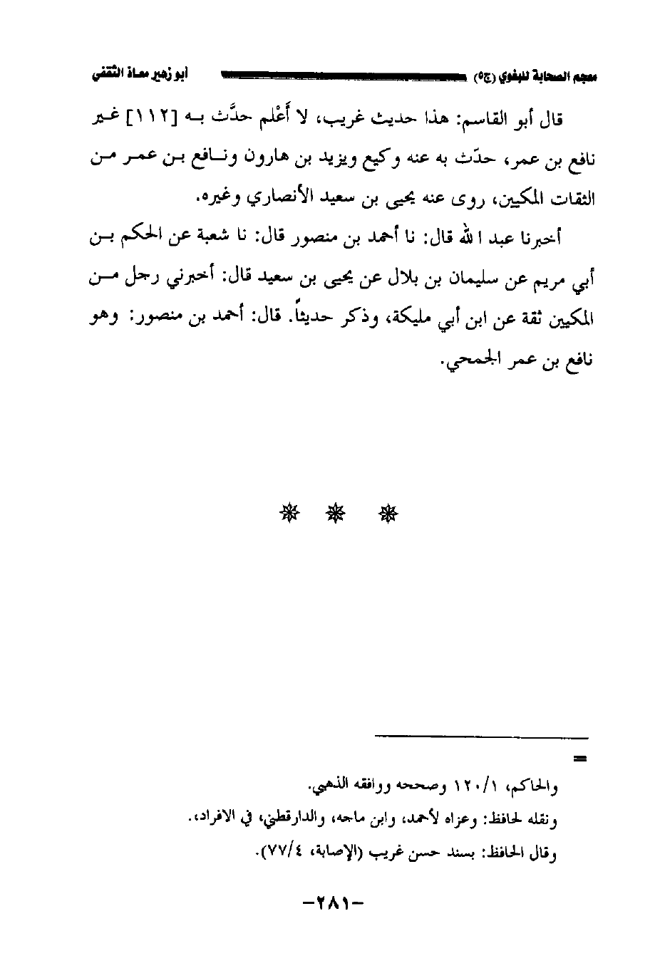 قال أبو القاسم: هذا حديثٌ غريبٌ , لا أعلم حدث به //١١٢//غير نافع بن عمر حدث به عنه وكيع ويزيد بن هارون ونافع بن عمر من الثقات المكيين روى عنه يحيى بن سعيد الأنصاريّ وغيره.