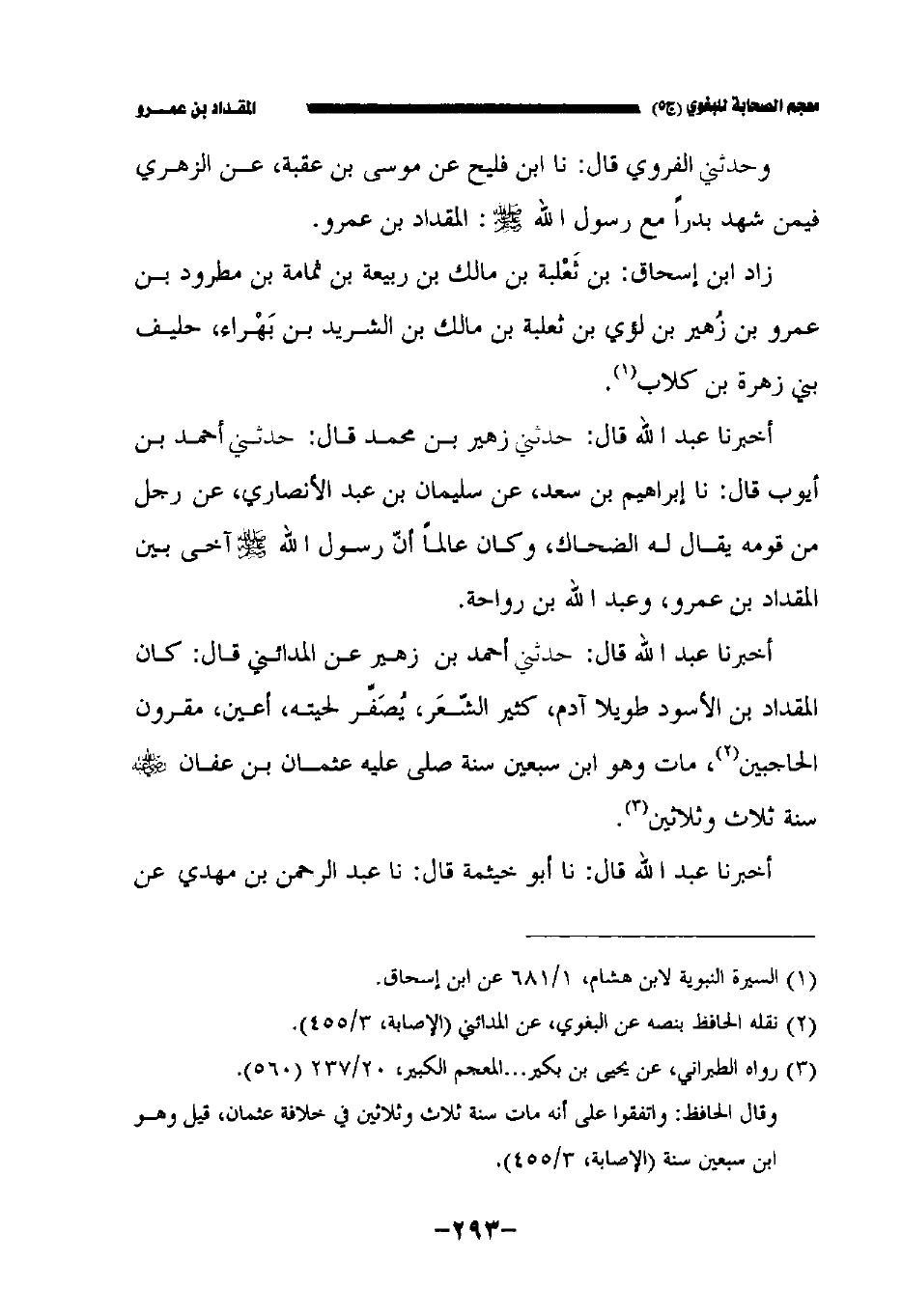 أخبرنا عبد الله قال: حدثني زهير بن محمد قال: حدثني أحمد بن أيوب قال: حدثنا إبراهيم بن سعد عن سليمان بن عبد الأنصاريّ عن رجل من قومه يقال له الضحاك وكان عالما أن رسول الله صلى الله عليه وسلم أخى بين المقداد بن عمرو وعبد الله بن رواحة.
