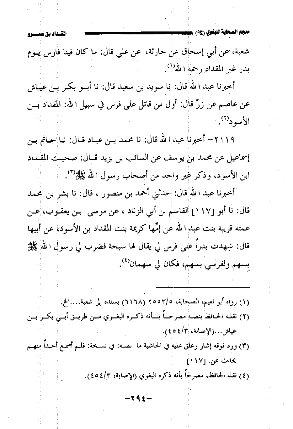 ٢١١٩ - أخبرنا عبد الله قال: حدثنا محمد بن عباد قال: حدثنا حاتم بن إسماعيل عن محمد بن يوسف عن السائب بن يزيد قال صحبت المقداد بن الأسود وذكر غير واحد من أصحاب رسول الله صلى الله عليه وسلم.